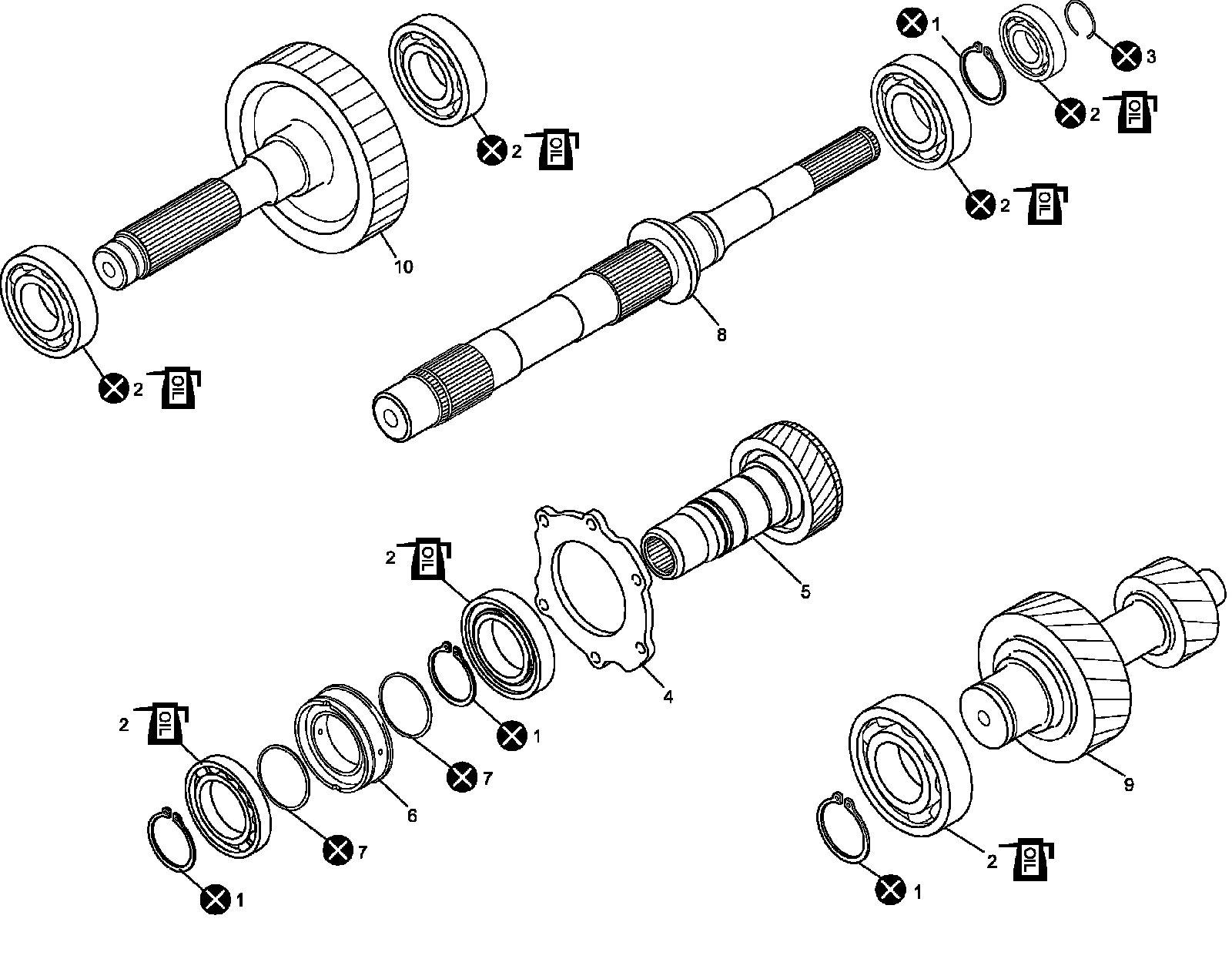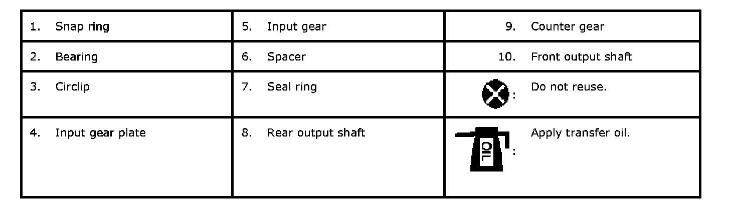 Input Gear Assembly, Counter Gear Assembly, Front Output Shaft Assembly and Rear Output Shaft Assembly Components