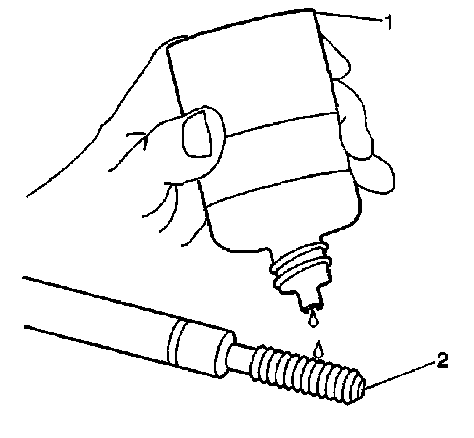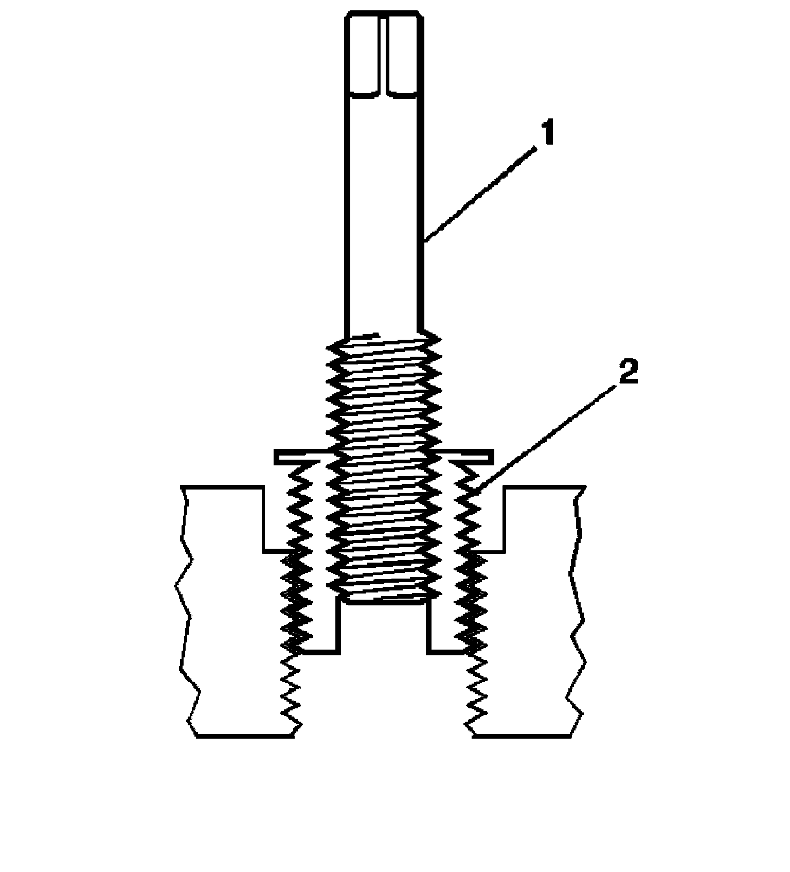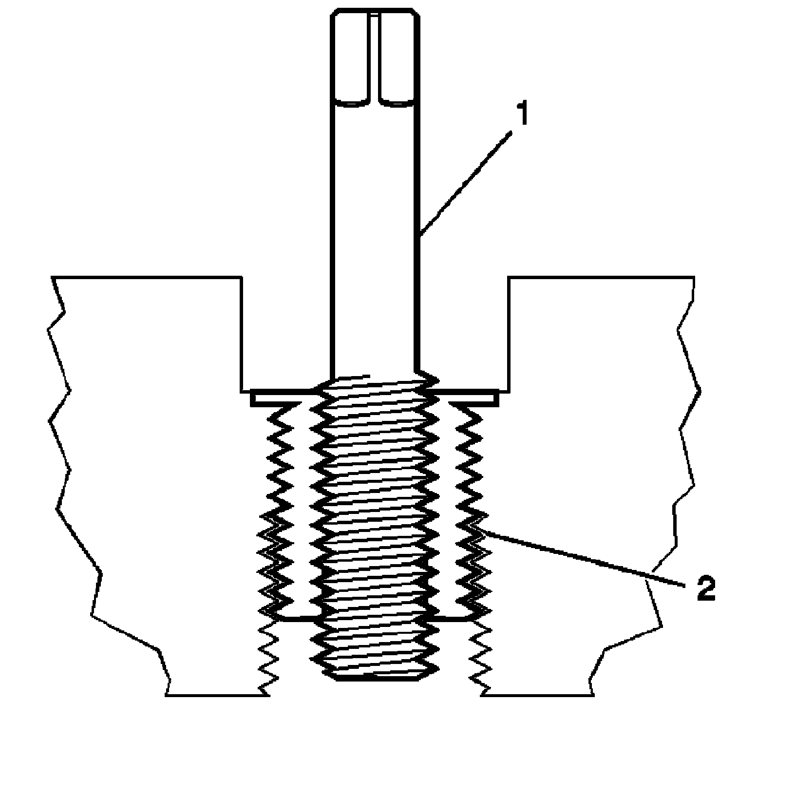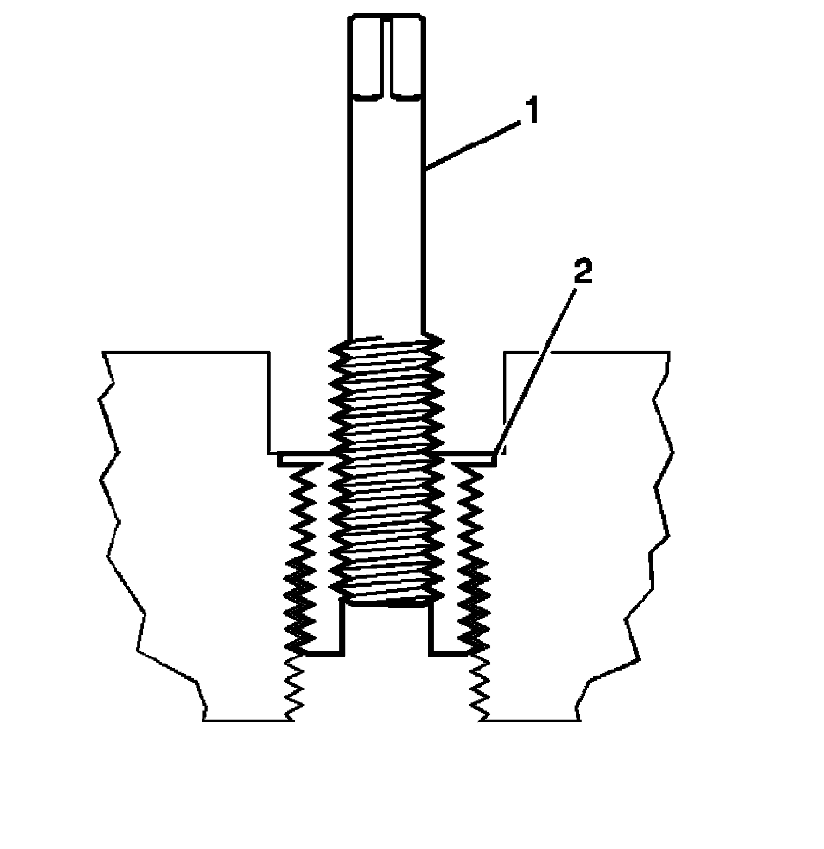 10. Apply threadlock sealant GM P/N 12345493, (Canadian P/N 10953488), J 42385-109, LOCTITE 277(R) or equivalent (1) to the insert OD threads (2).