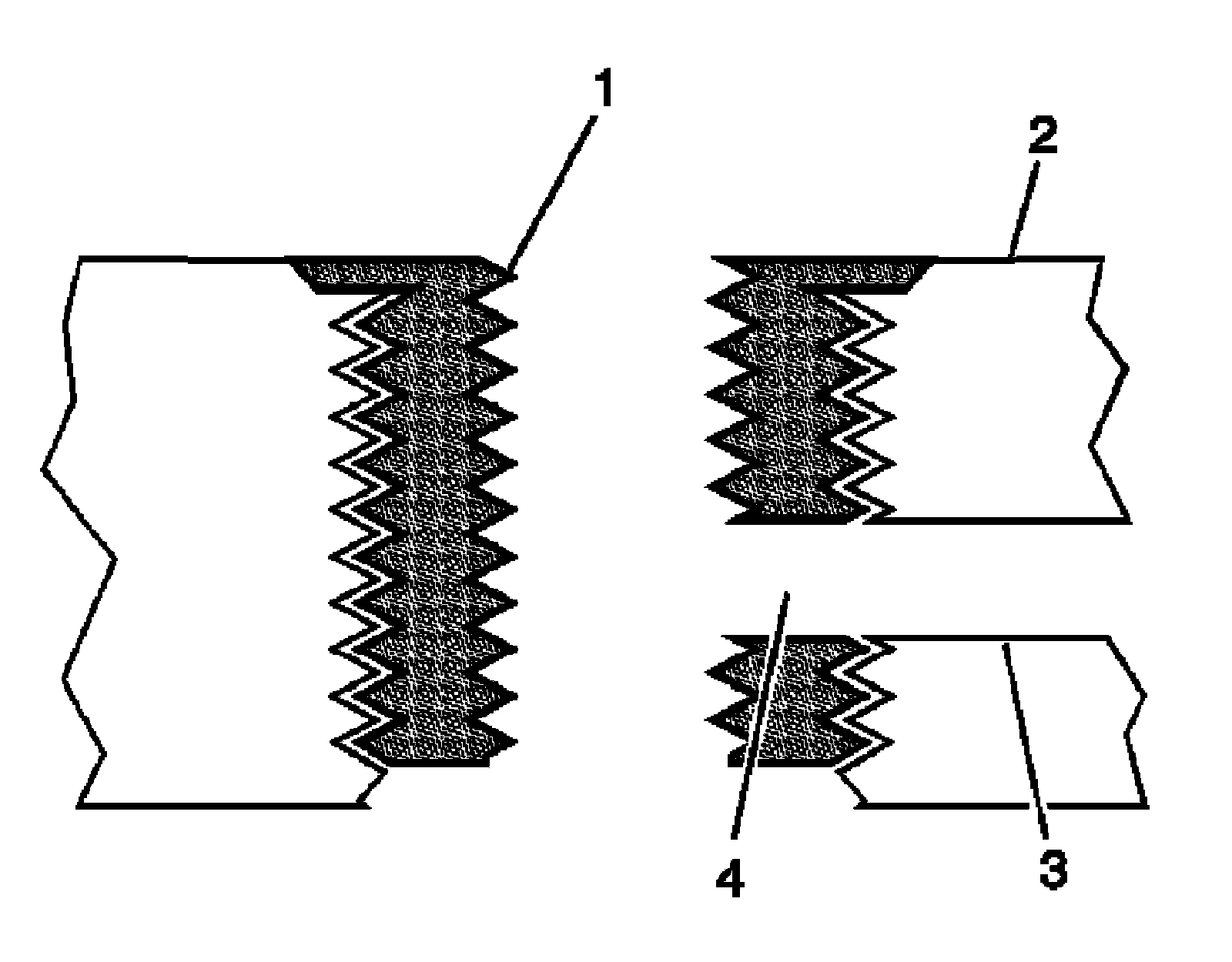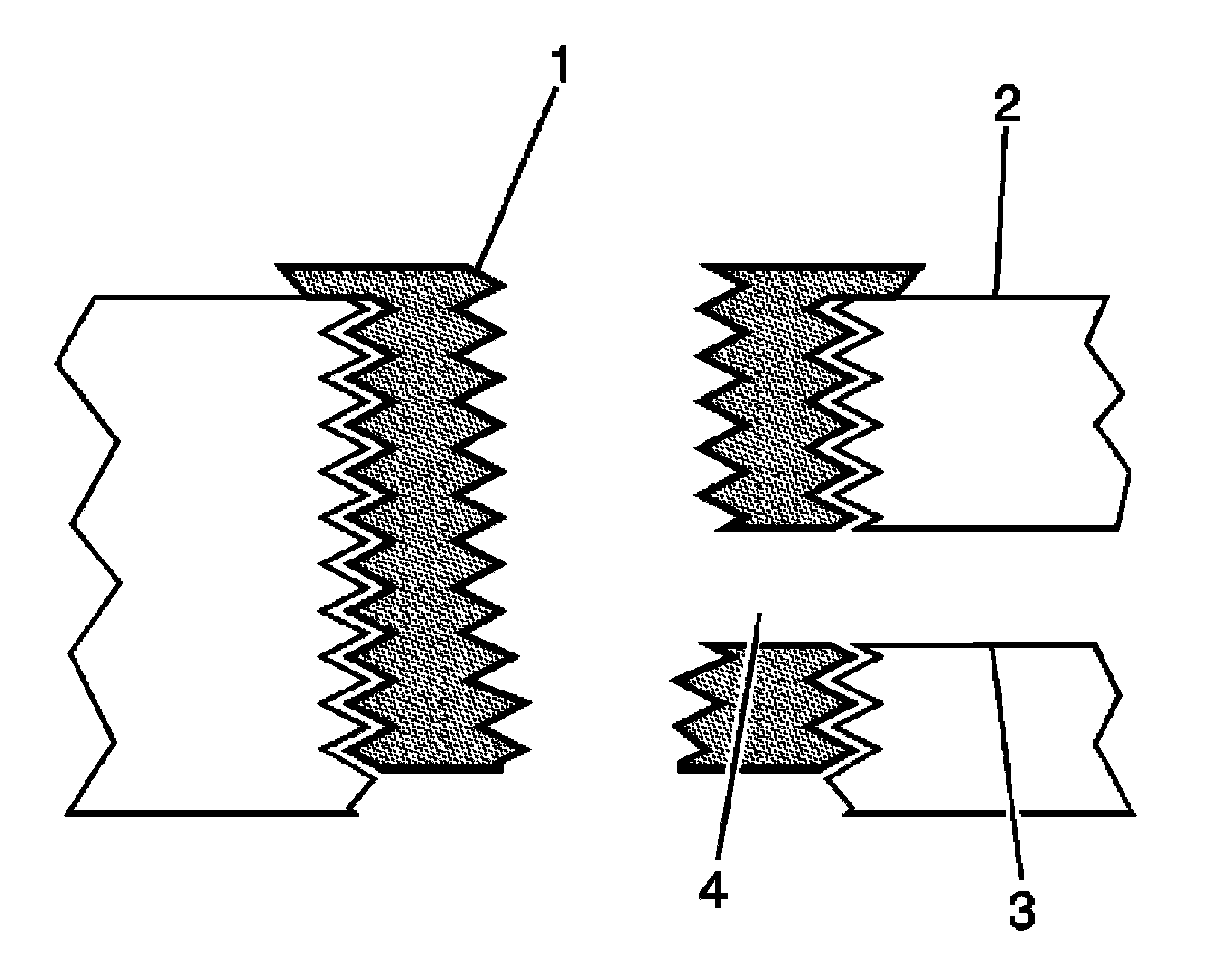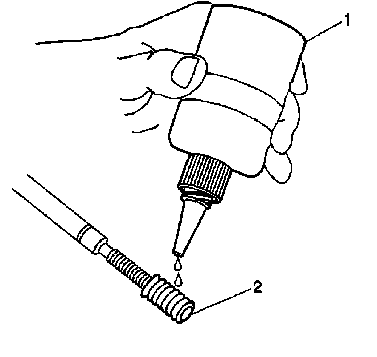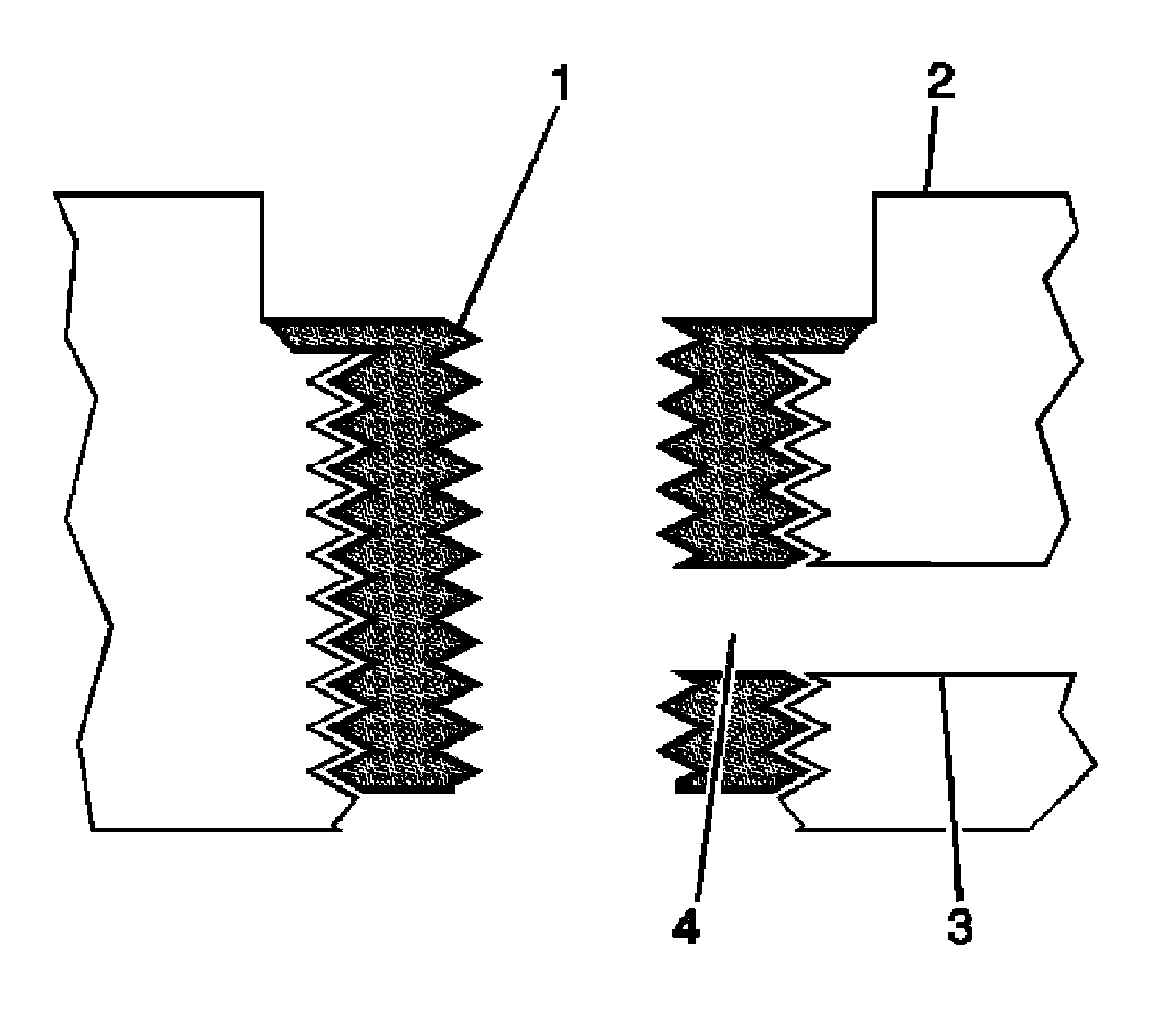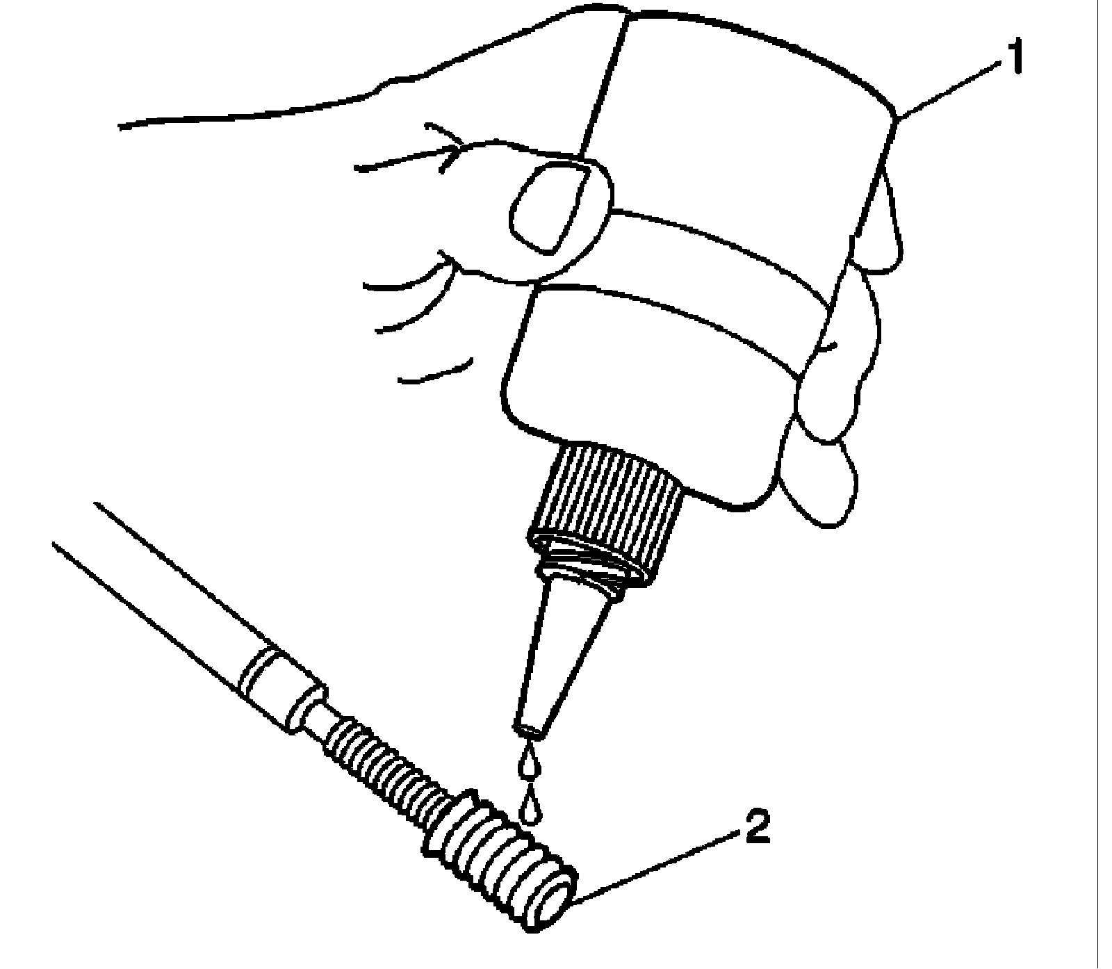 10. Apply threadlock sealant GM P/N 12345493, (Canadian P/N 10953488), J 42385-109, LOCTITE 277(R) or equivalent (1) to the insert OD threads (2).
