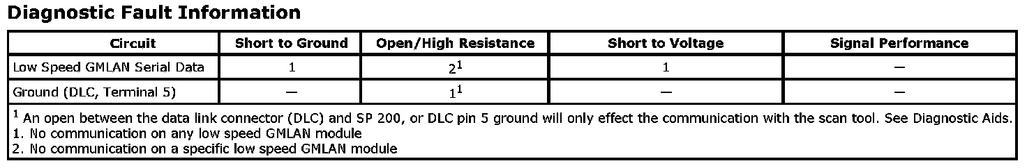 Modules connected to the low speed GMLAN serial data circuit monitor for serial data communications during normal vehicle operation. Operating information and commands are exchanged among the modules when the ignition switch is in any position other than OFF. The low speed GMLAN serial data circuit must be operational for the vehicle to start so the vehicle theft deterrent (VTD) module and body control module (BCM) can communicate. The low speed GMLAN serial data circuit uses SP 200 as the common connection between the modules and the data link connector (DLC).