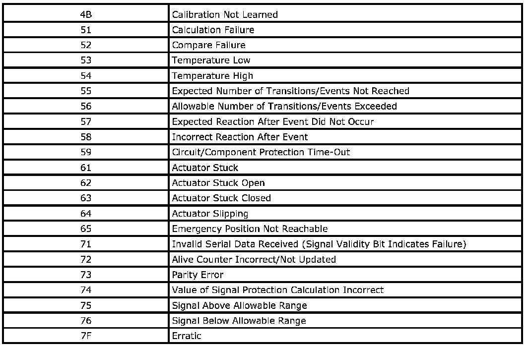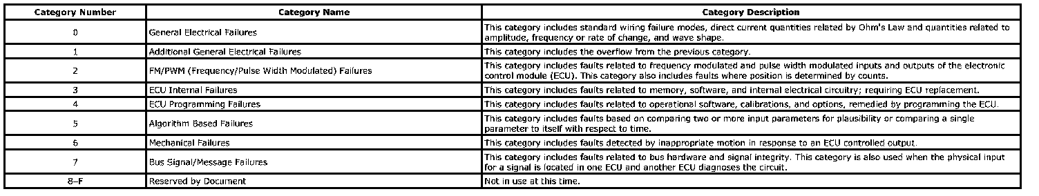 The DTC symptom is made up of 2 alphanumeric digits. The first digit following the DTC indicates the DTC symptom category. There are 16 possible categories available in the range of 0 through the letter F. Currently there are 8 categories in use, 0 through 7. These 8 categories together with their definitions are given.