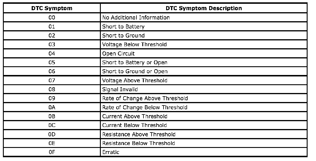 A DTC symptom is a 2-digit number which adds additional detail to a DTC. The DTC symptom provides additional information without requiring a large increase in the number of new DTCs.