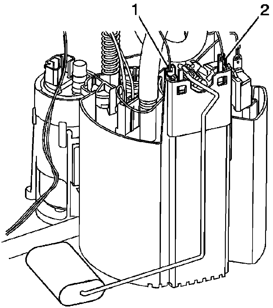 1. Install the fuel level sender unit and float onto the fuel pump module. Make sure that the sender cap snaps into place (1, 2).