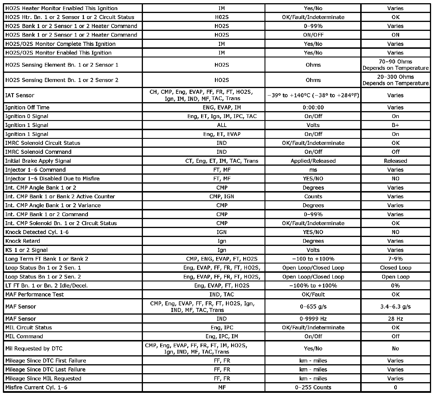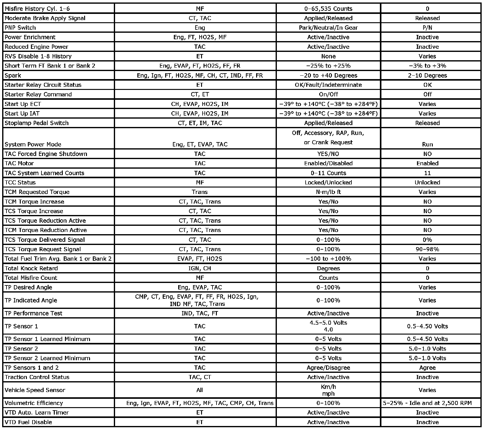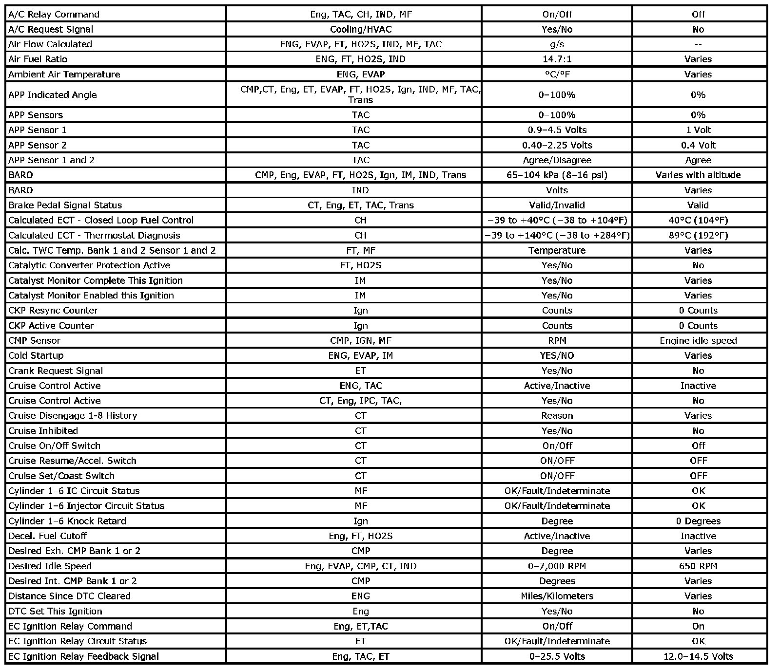 Only the parameters listed below are referenced in this service information for use in diagnosis. If all values are within the typical range described below, refer to [Symptoms - Computers and Control Systems] for diagnosis. The column labeled Data List indicates where a parameter is located on the scan tool. Review the scan tool operating manual for the exact locations of the data lists. The following is a description of each term listed: Symptoms - Computers and Control Systems