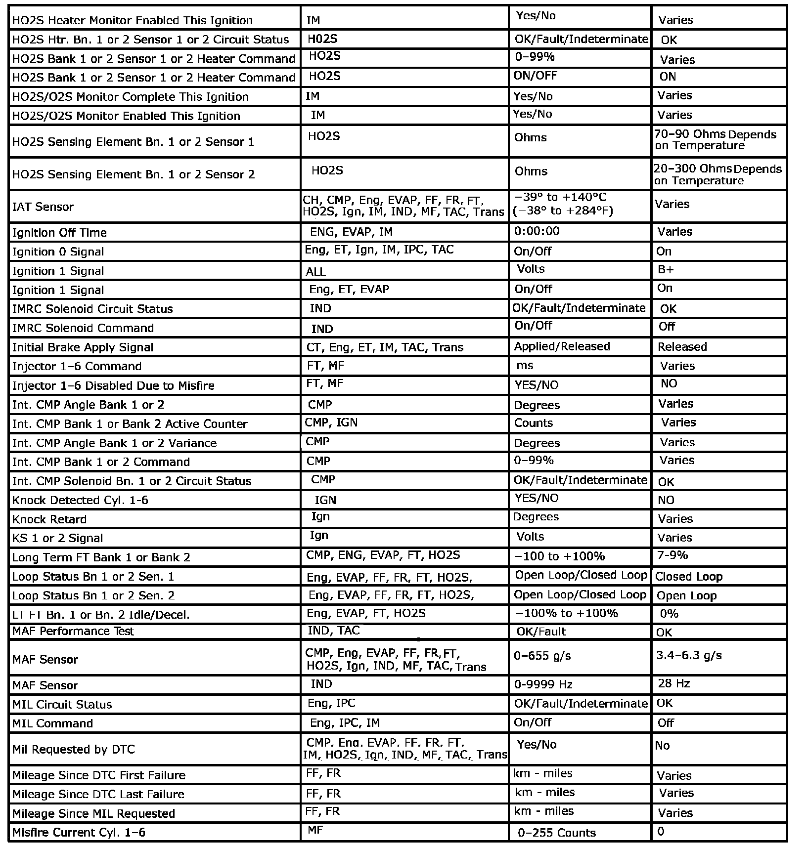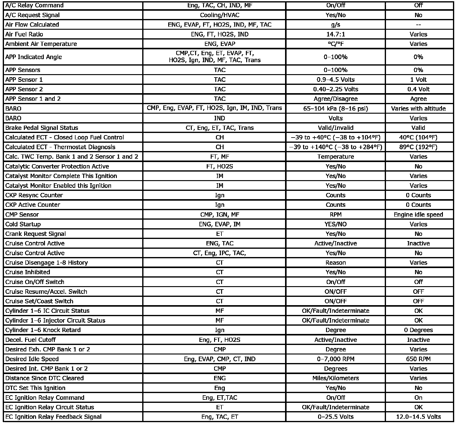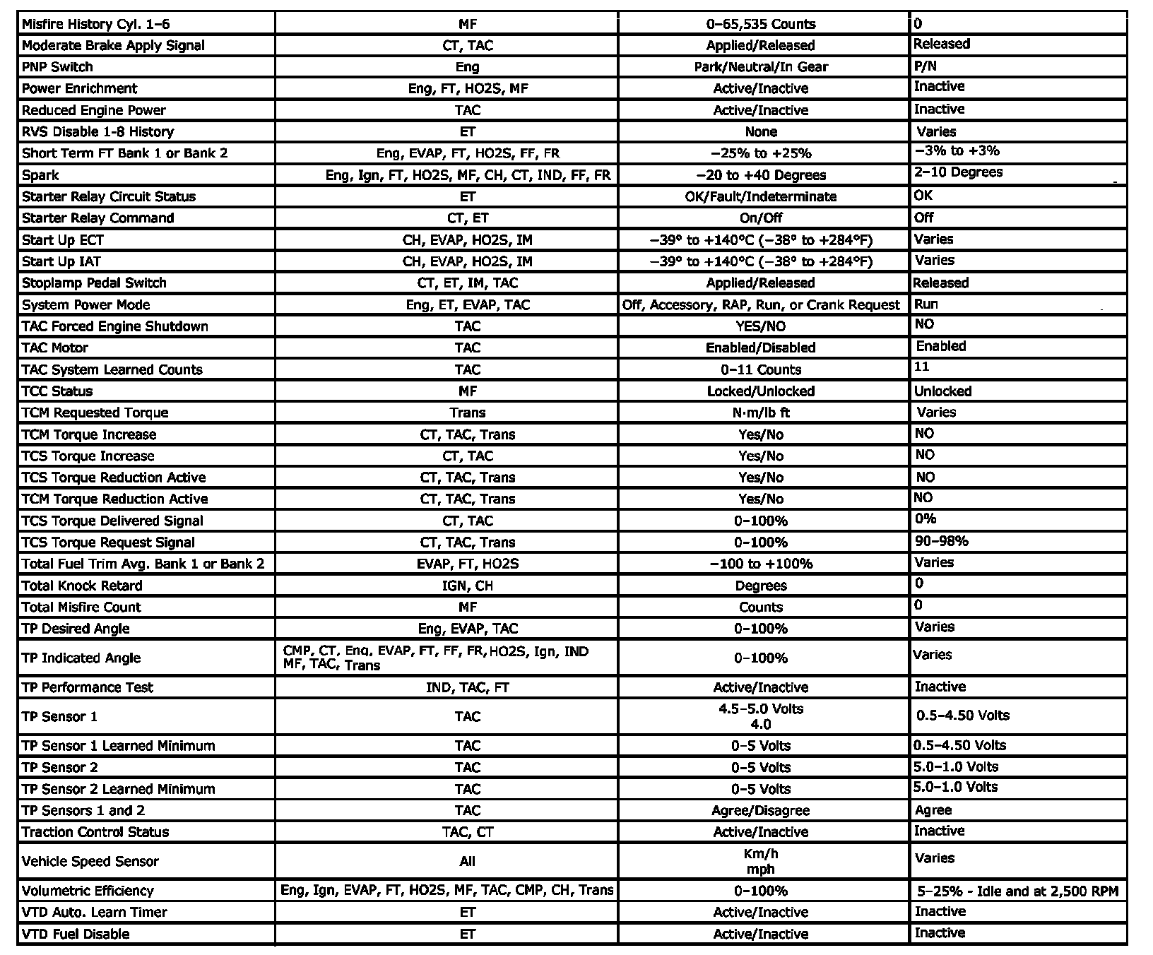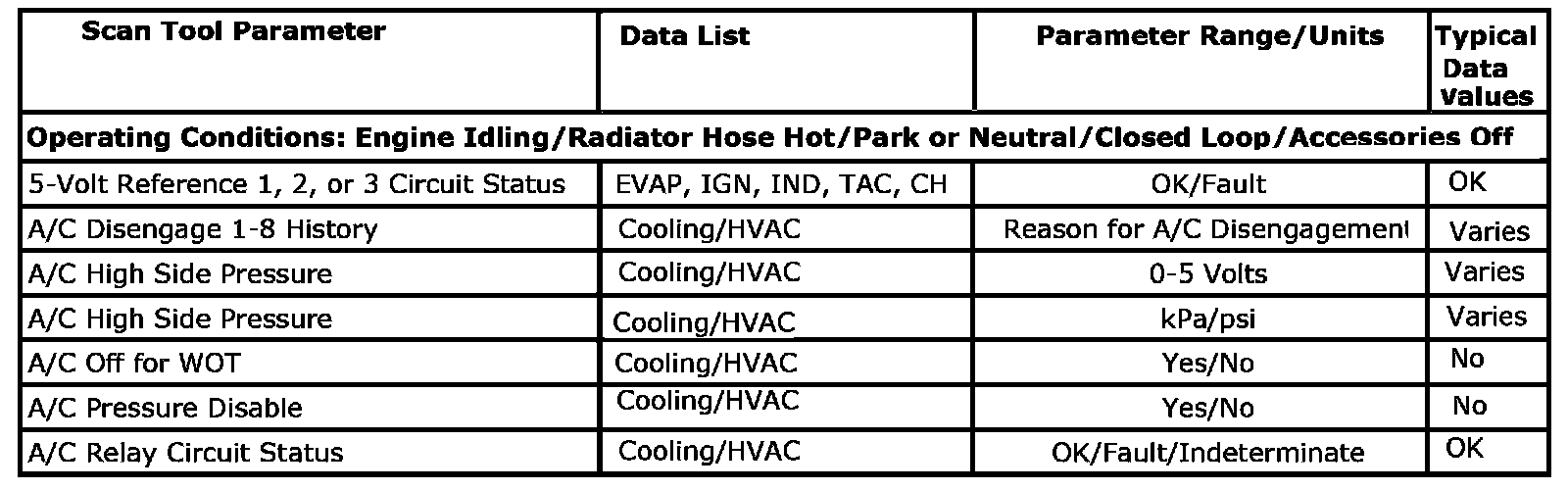 Only the parameters listed below are referenced in this service information for use in diagnosis. If all values are within the typical range described below, refer to Symptoms - Engine Controls. The column labeled Data List indicates where a parameter is located on the scan tool. Review the scan tool operating manual for the exact locations of the data lists. The following is a description of each term listed: