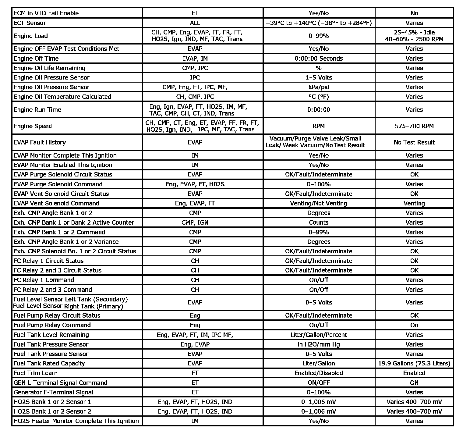 Scan tool values from an engine that is operating correctly may be used for comparison with the engine you are diagnosing. The Engine Scan Tool Data List represents the values that would be seen on a normal operating engine.