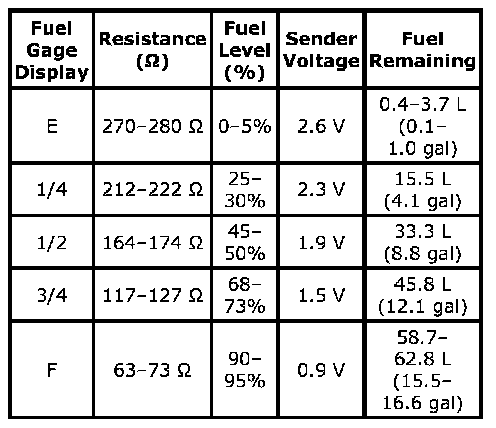 Fuel Level SpecificationsThe information in this table is intended for use with the J 33431-C Signal Generator and Instrument Panel Tester. The fuel level sensor values represent the test values to be used on the Signal Generator to drive the fuel gage display to the indicated positions. Vehicles that require more than one fuel level sensor calculate gage position from many possible resistance combinations of fuel levels between the two tanks. Therefore, the values in the table may not correlate directly to readings taken from the vehicle primary or secondary sending units. The values in the table are approximate values based on information obtained from properly operating vehicles. Actual results may vary slightly.