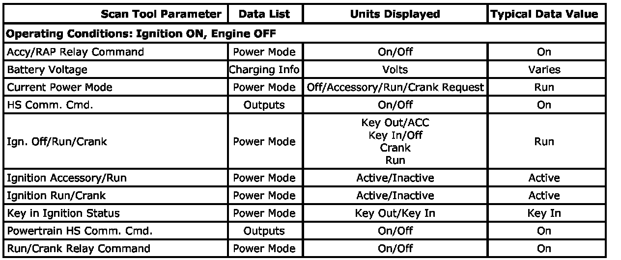 Scan Tool Data List - Wiring Systems and Power ManagementUse the scan tool data display values and definitions information in order to assist in diagnosing vehicle malfunctions. Compare the vehicles actual scan tool data with the typical data display value table information. Use the information in order to aid in understanding the nature of the concern when the vehicle data does not match the typical data display values.