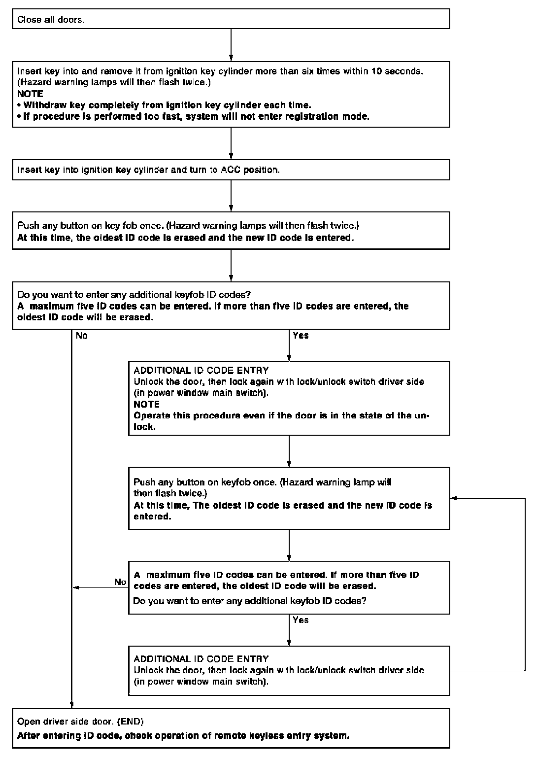 - When registering an additional keyfob, the existing ID codes in memory may or may not be erased. If five ID codes are stored in memory, when an additional code is registered, only the oldest code is erased. If less than five ID codes are stored in memory, when an additional ID code is registered, the new ID code is added and no ID codes are erased.