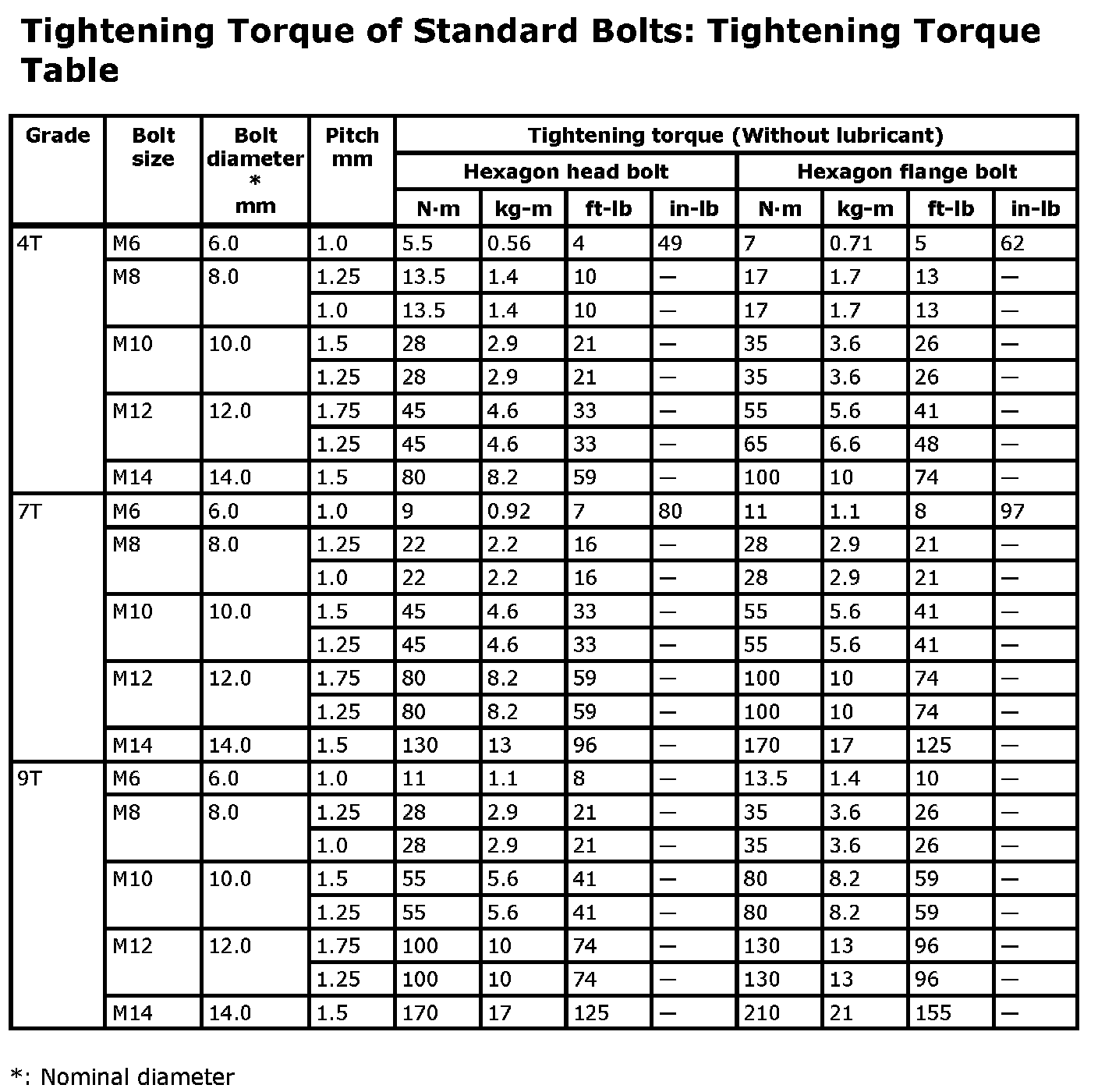 Tightening Torque of Standard Bolts: Tightening Torque Table