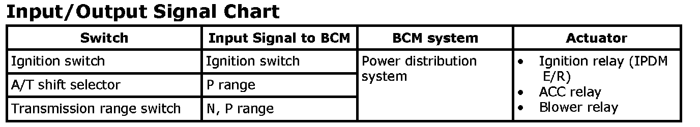 - The ignition switch operation is input to BCM as a signal. BCM changes the power supply position according to the status and operates the ignition relay (inside IPDM E/R) to supply power to each power circuit.