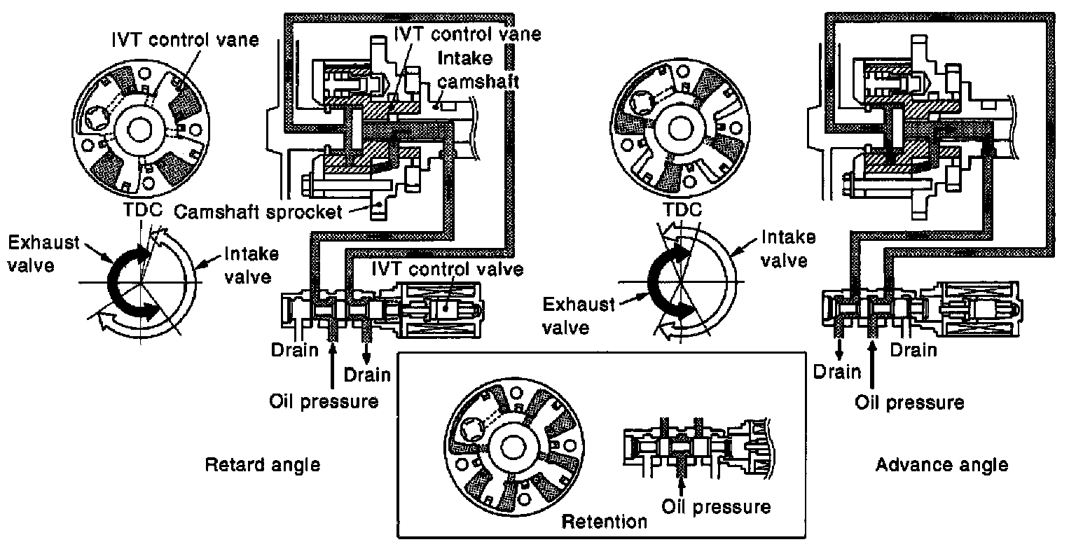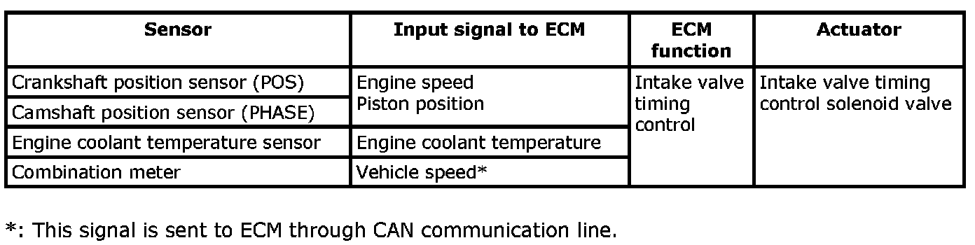 The ECM receives signals such as crankshaft position, camshaft position, engine speed, and engine coolant temperature. Then, the ECM sends ON/OFF pulse duty signals to the intake valve timing control solenoid valve depending on driving status. This makes it possible to control the shut/open timing of the intake valve to increase engine torque in low/mid speed range and output in high-speed range.