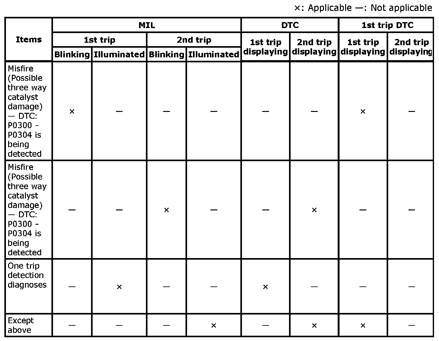 If the same malfunction is detected again during the next drive, the DTC and Freeze Frame data are stored in the ECM memory, and the MIL illuminates. The MIL illuminates at the same time the DTC is stored. [2nd trip] The "trip" in the "Two Trip Detection Logic" means a driving mode in which self-diagnosis is performed during vehicle operation. Specific on board diagnostic items will cause the ECM to illuminate or blink the MIL, and store DTC and Freeze Frame data, even in the 1st trip, as shown below.