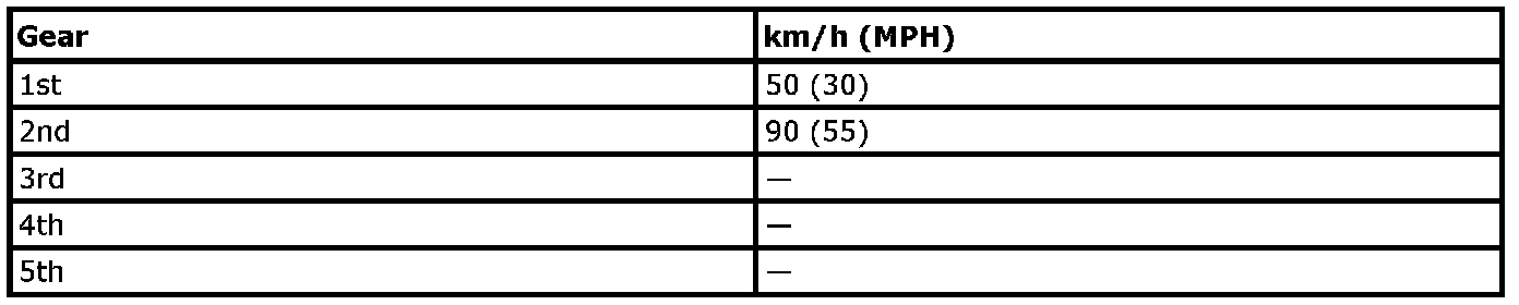 Downshift to a lower gear if the engine is not running smoothly, or if you need to accelerate. Do not exceed the maximum suggested speed (shown below) in any gear. For level road driving, use the highest gear suggested for that speed. Always observe posted speed limits and drive according to the road conditions to ensure safe operation. Do not over-rev the engine when shifting to a lower gear as it may cause engine damage or loss of vehicle control.