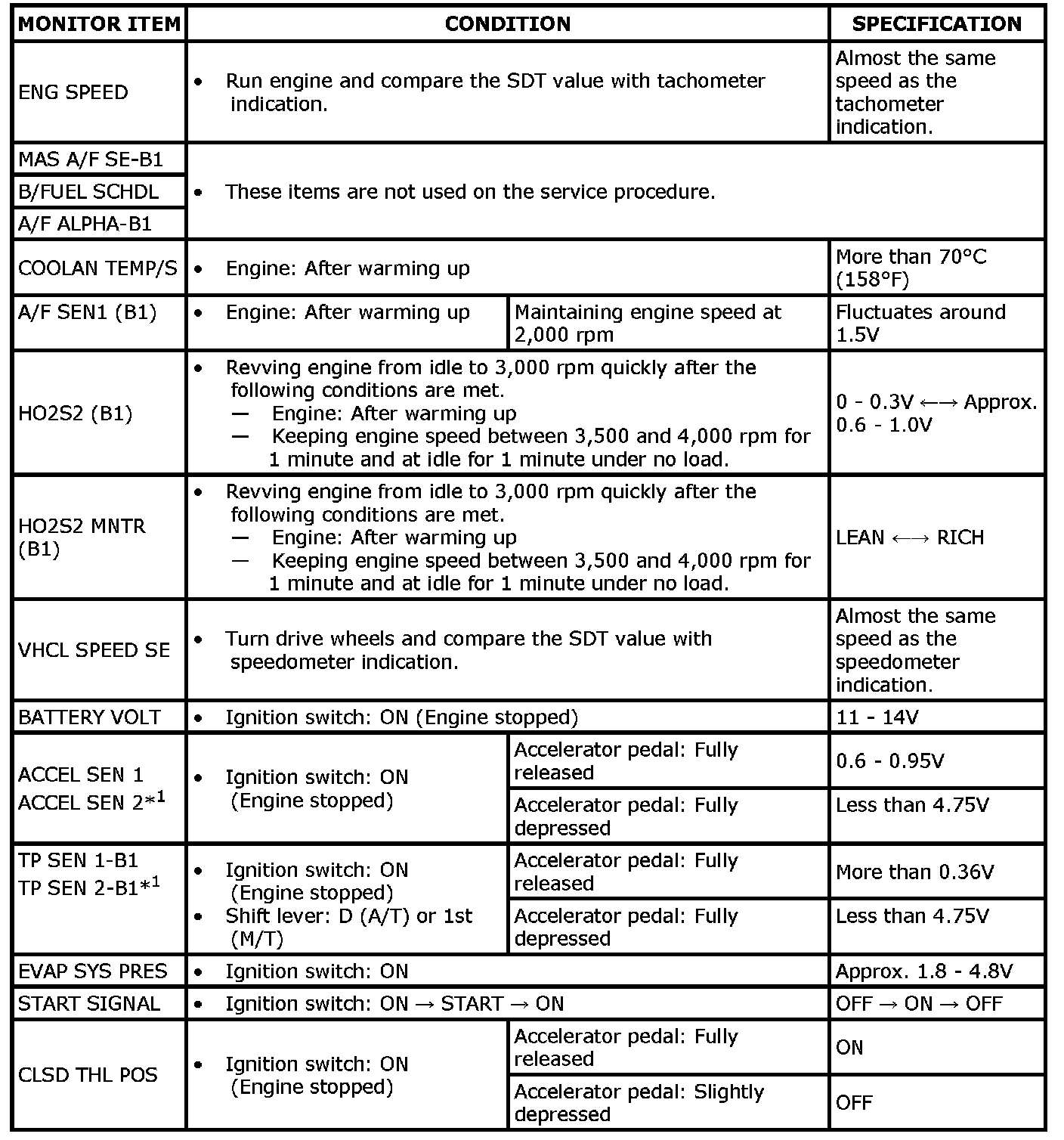 * Specification data may not be directly related to their components signals/values/operations. i.e. Adjust ignition timing with a timing light before monitoring IGN TIMING, because the monitor may show the specification data in spite of the ignition timing not being adjusted to the specification data. This IGN TIMING monitors the data calculated by the ECM according to the signals input from the camshaft position sensor and other ignition timing related sensors.