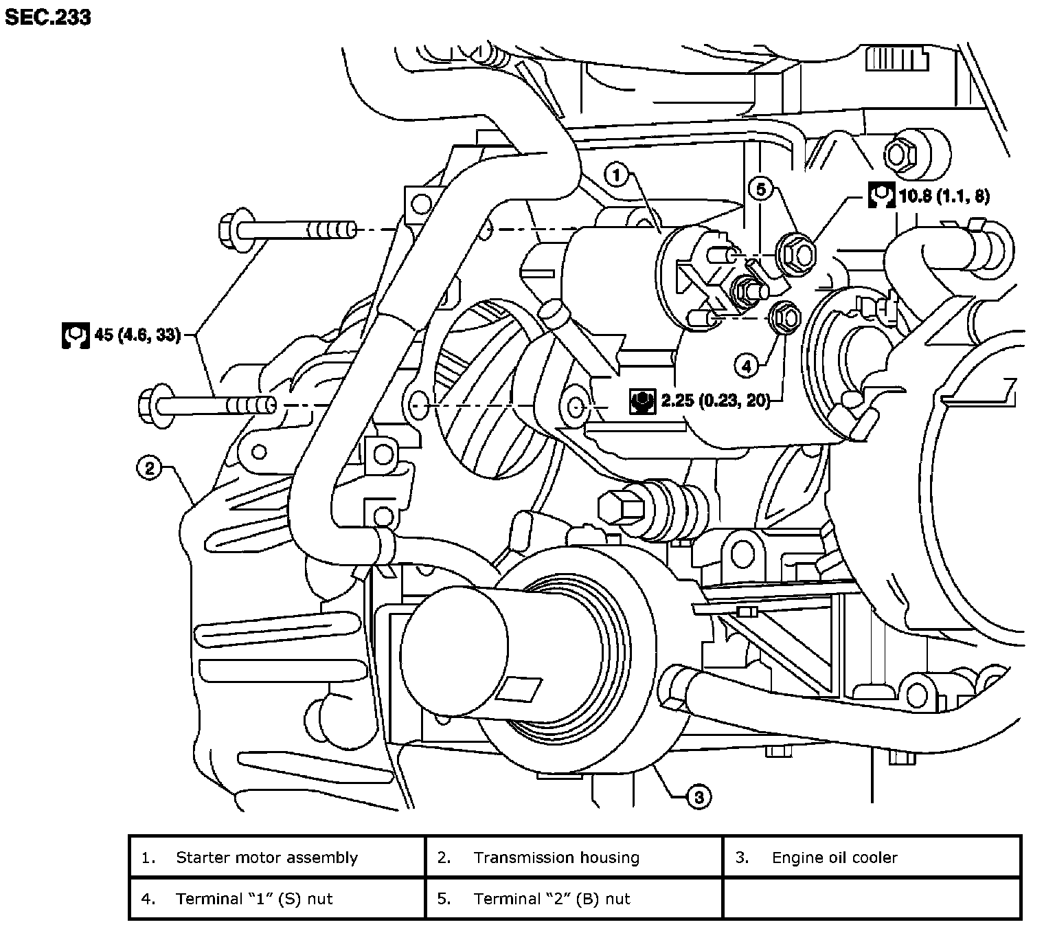 4. Remove the two starter motor bolts, using power tools.
