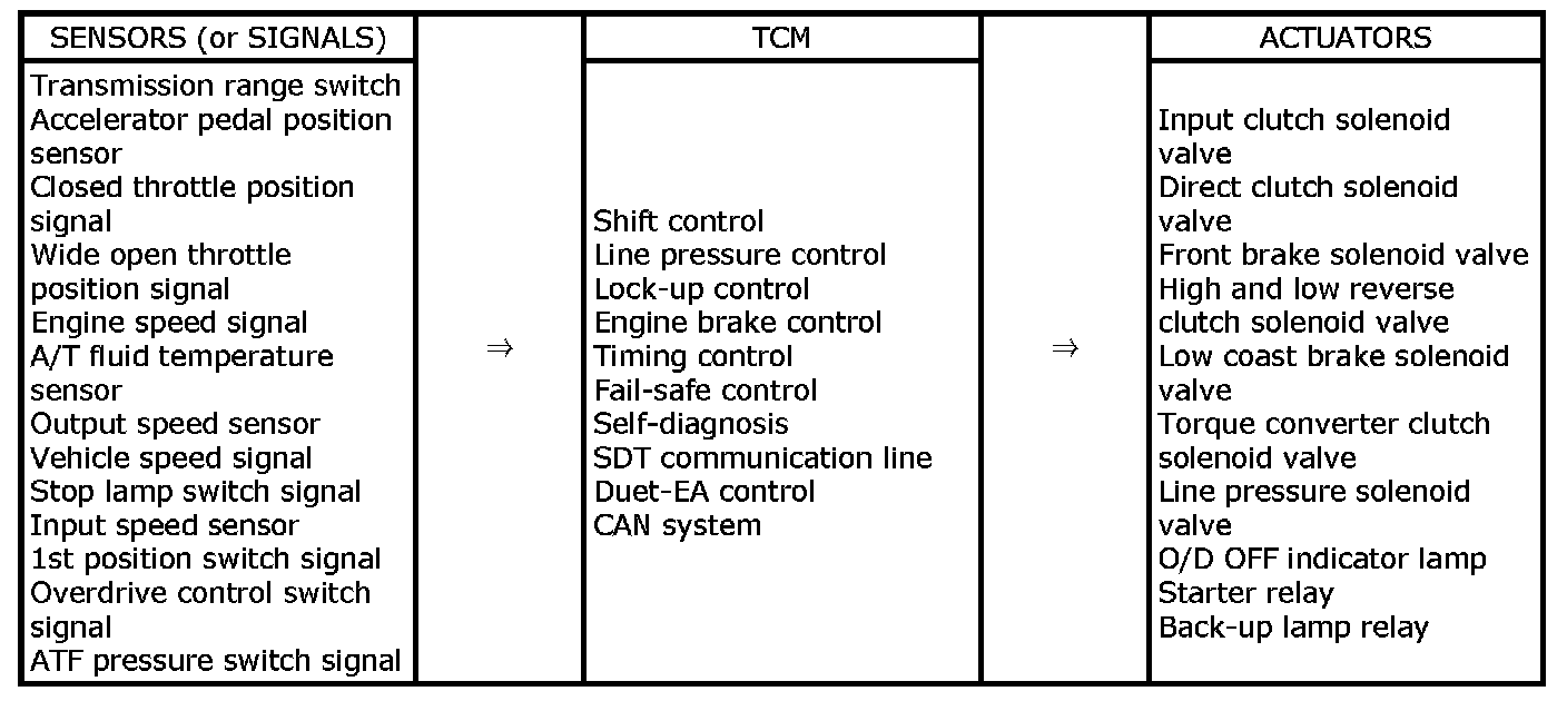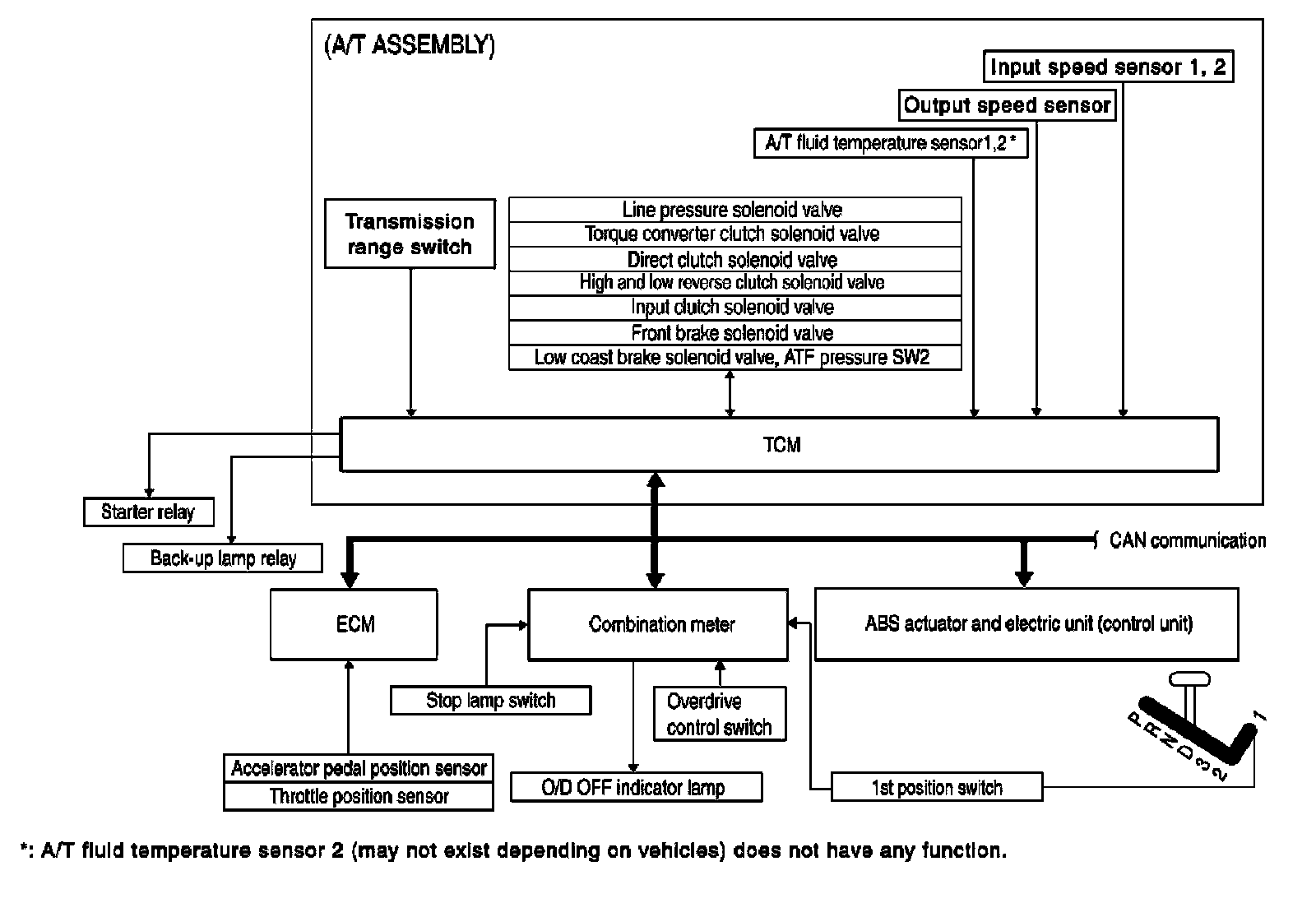 The A/T senses vehicle operating conditions through various sensors or signals. It always controls the optimum shift position and reduces shifting and lock-up shocks.