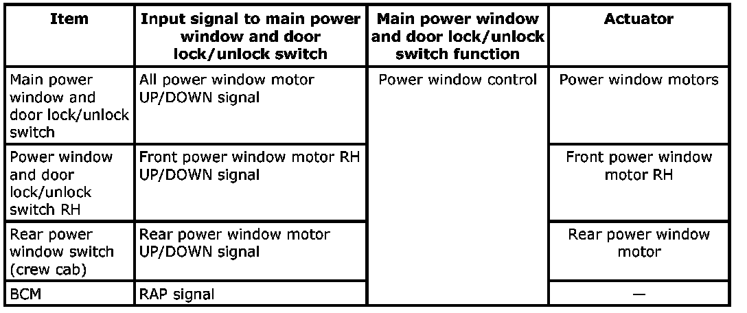 - Power window and door lock unlock switch RH & rear power window switches LH and RH (crew cab) can open/close the corresponding windows.