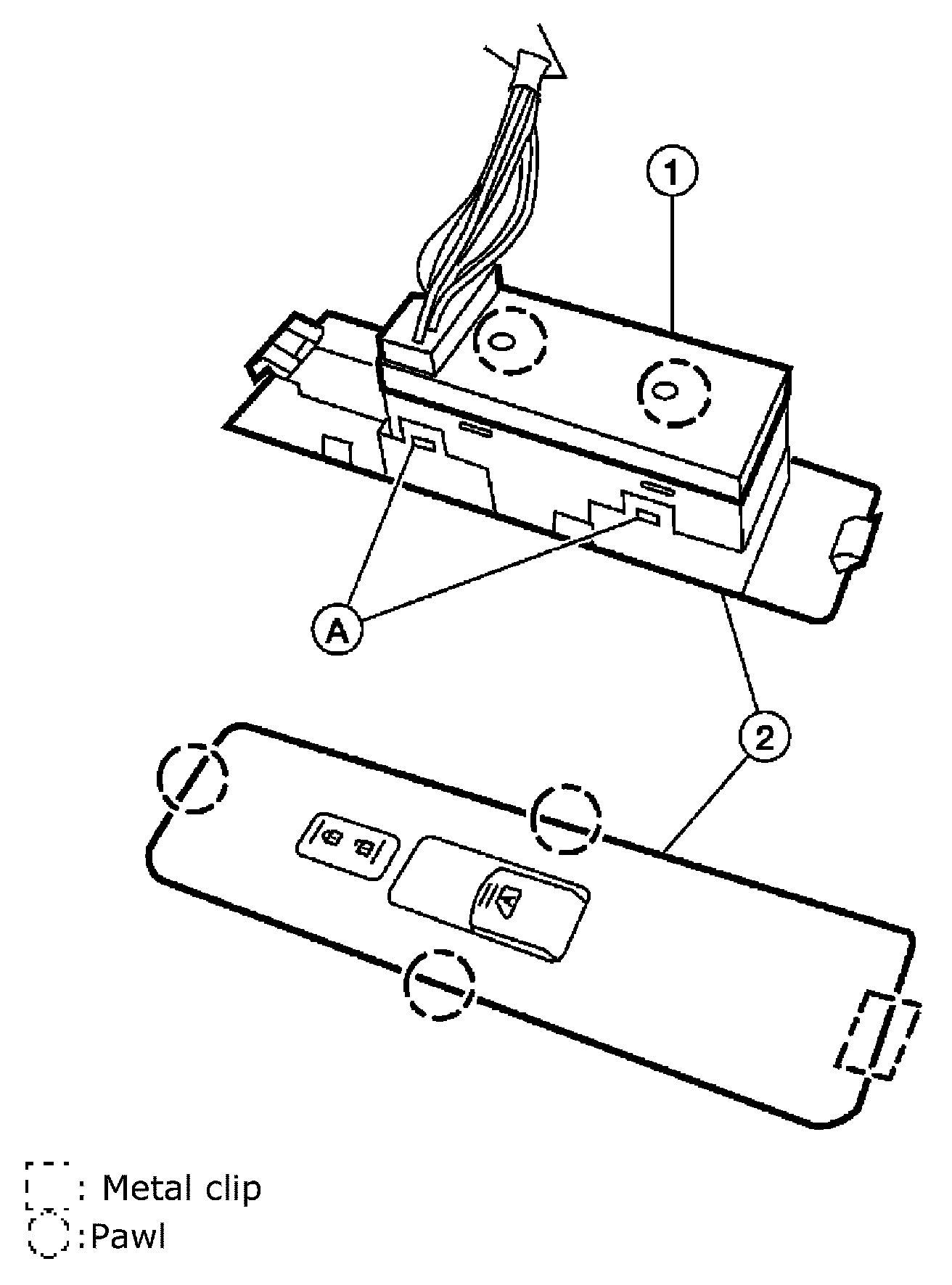 1. Remove the front power window switch finisher (2) from the front door finisher RH. Refer to [Door Finisher: Removal and Installation].