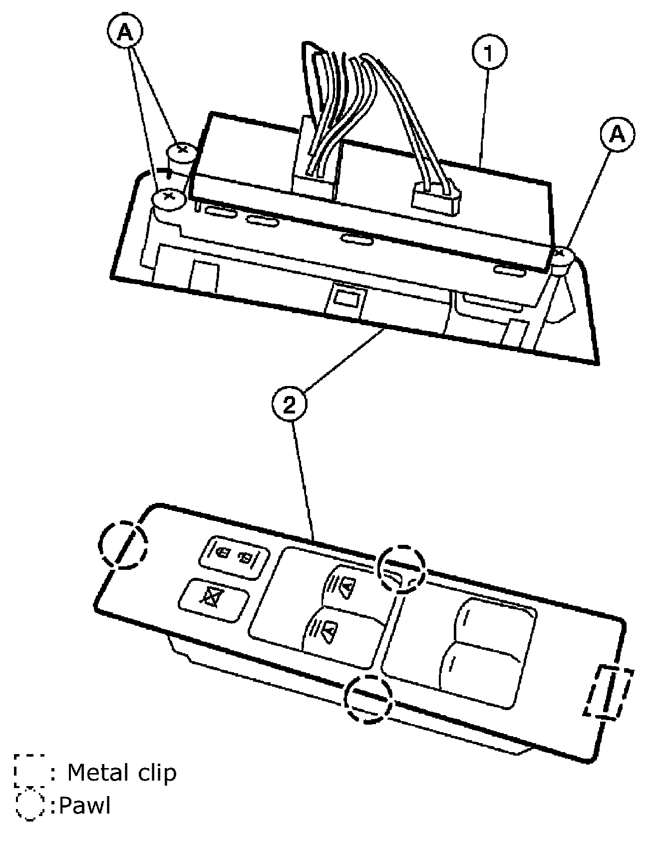 2. Remove the three screws (A) from the power window main switch (1), then separate from the finisher (2).