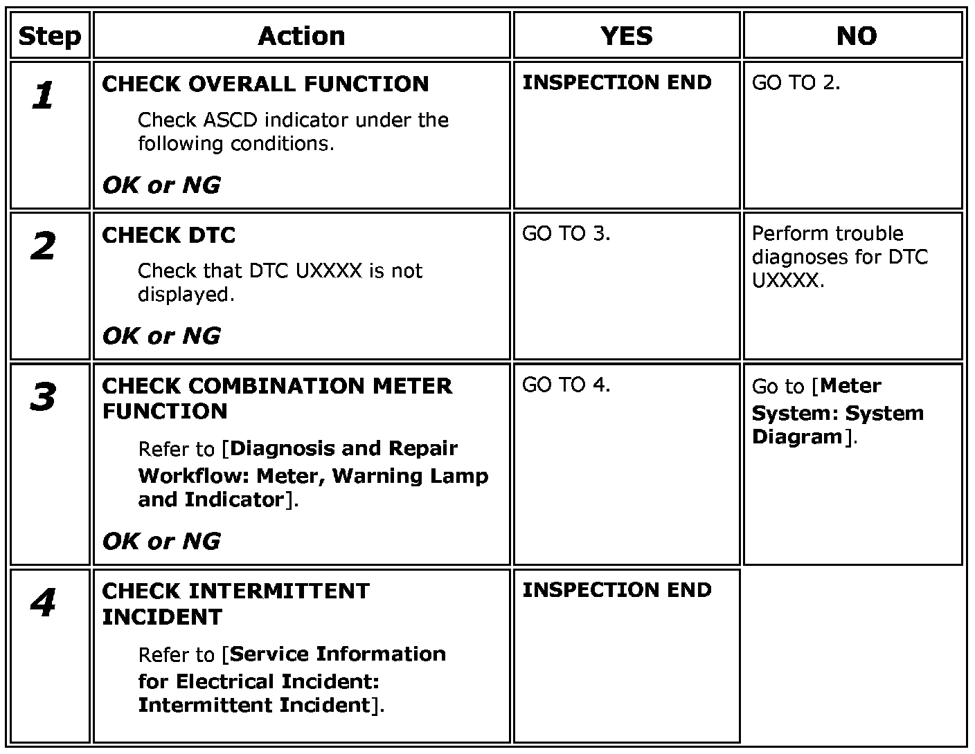ASCD indicator lamp illuminates to indicate ASCD operation status. Lamp has two indicators, CRUISE and SET, and is integrated in combination meter. CRUISE indicator illuminates when MAIN switch on ASCD steering switch is turned ON to indicated that ASCD system is ready for operation. SET indicator illuminates when the following conditions are met.