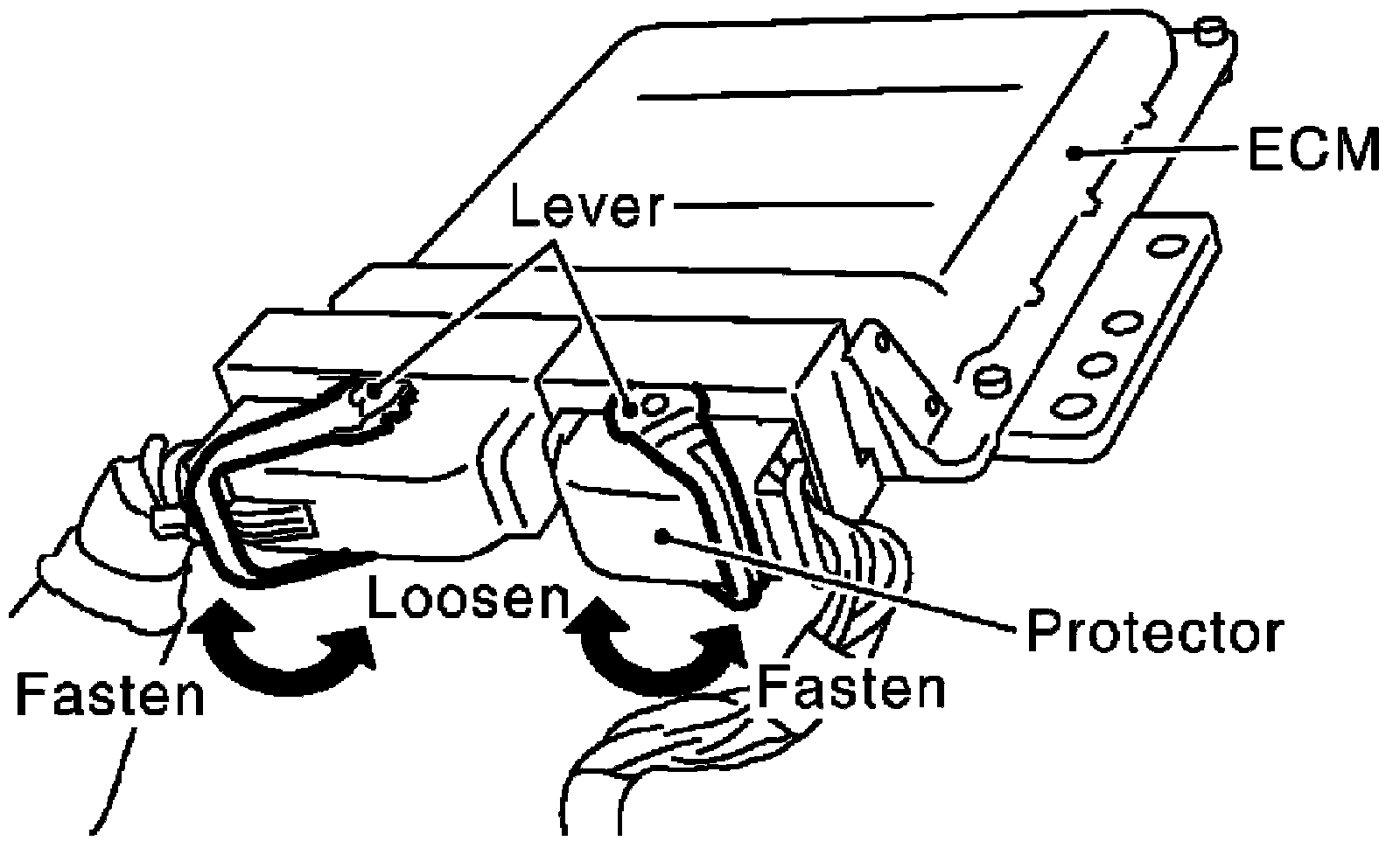 - When connecting ECM harness connector, fasten it securely with levers as far as they will go as shown in the figure.