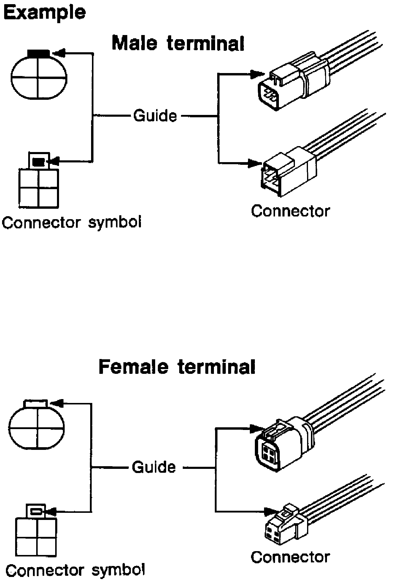 Connector guides for male terminals are shown in black and female terminals in white in wiring diagrams.