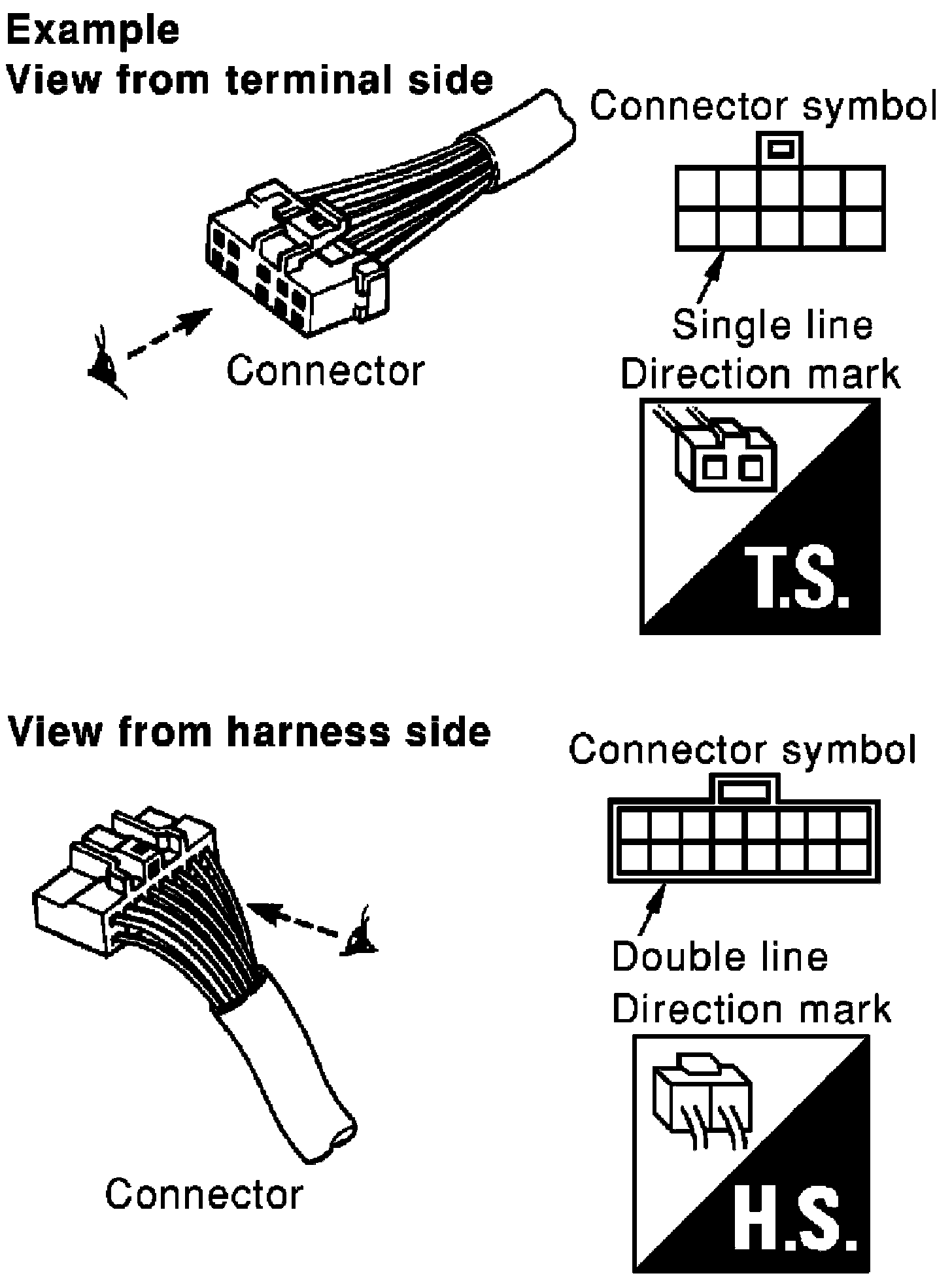 - Connector symbols shown from the terminal side are enclosed by a single line and followed by the direction mark.