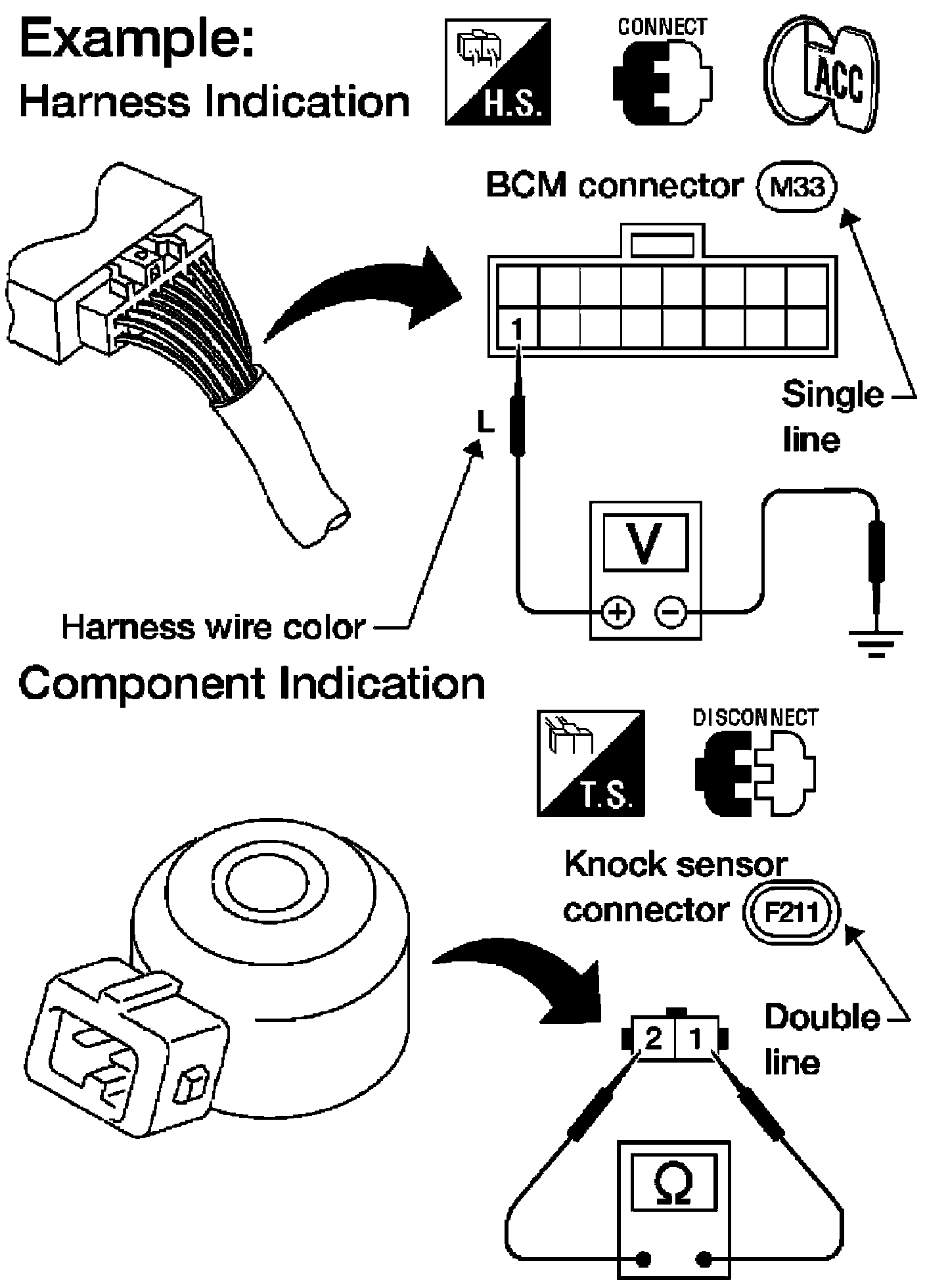 - Connector symbols shown from the harness side are enclosed by a double line and followed by the direction mark.
