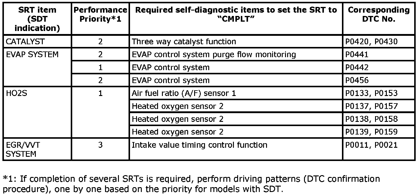 NOTE: SRT can be set as "CMPLT" together with the DTC(s). Therefore, DTC check must always be carried out prior to the state emission inspection even though the SRT indicates "CMPLT".