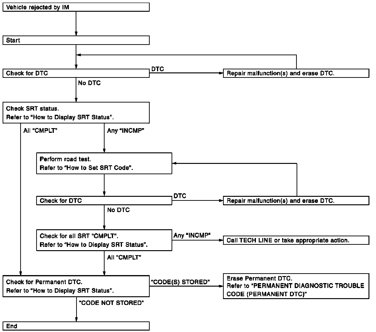 NOTE: If permanent DTC is stored or MIL illuminates during the state emissions inspection, the vehicle is also returned to the customer untested even though the SRT indicates "CMPLT" for all test items. Therefore, it is important to check SRT ("CMPLT"), DTC (No DTCs) and permanent DTC (No permanent DTCs) before the inspection.
