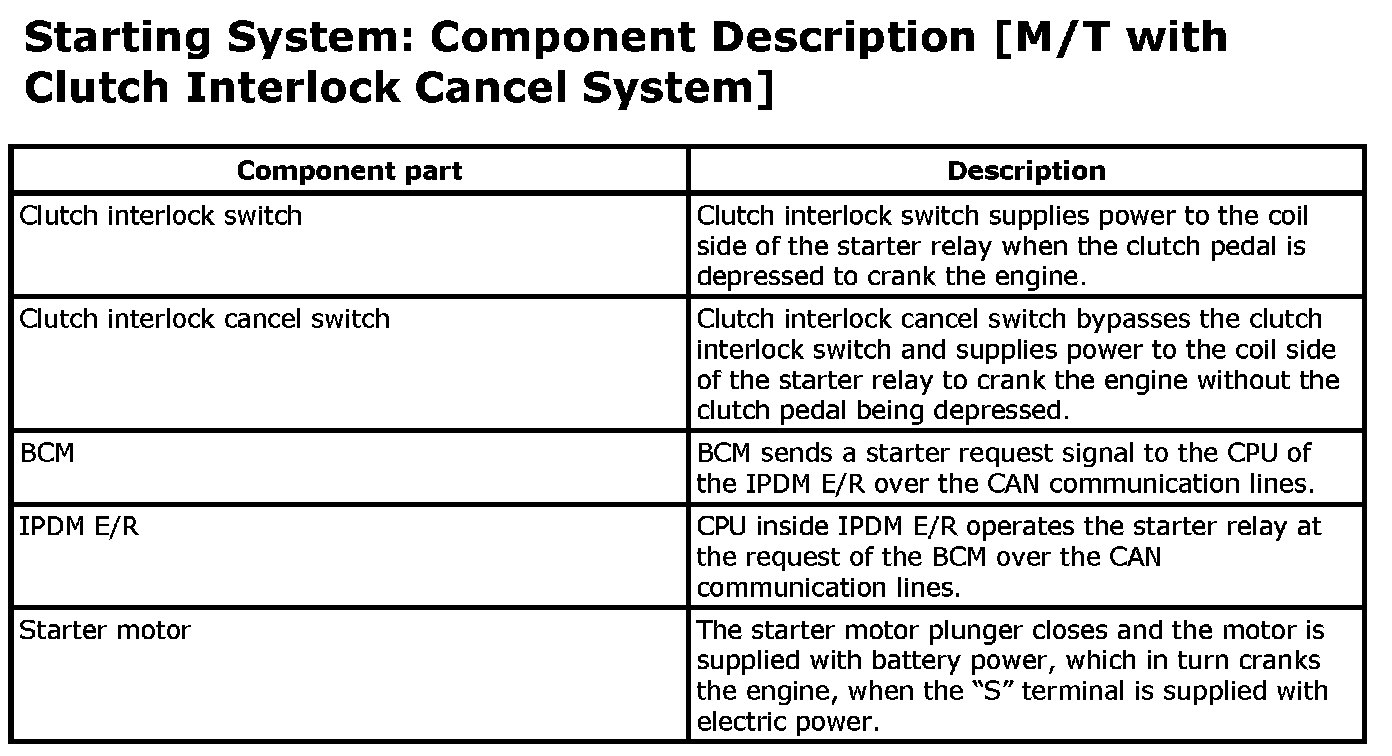 Starting System: Component Description [M/T With Clutch Interlock Cancel System]