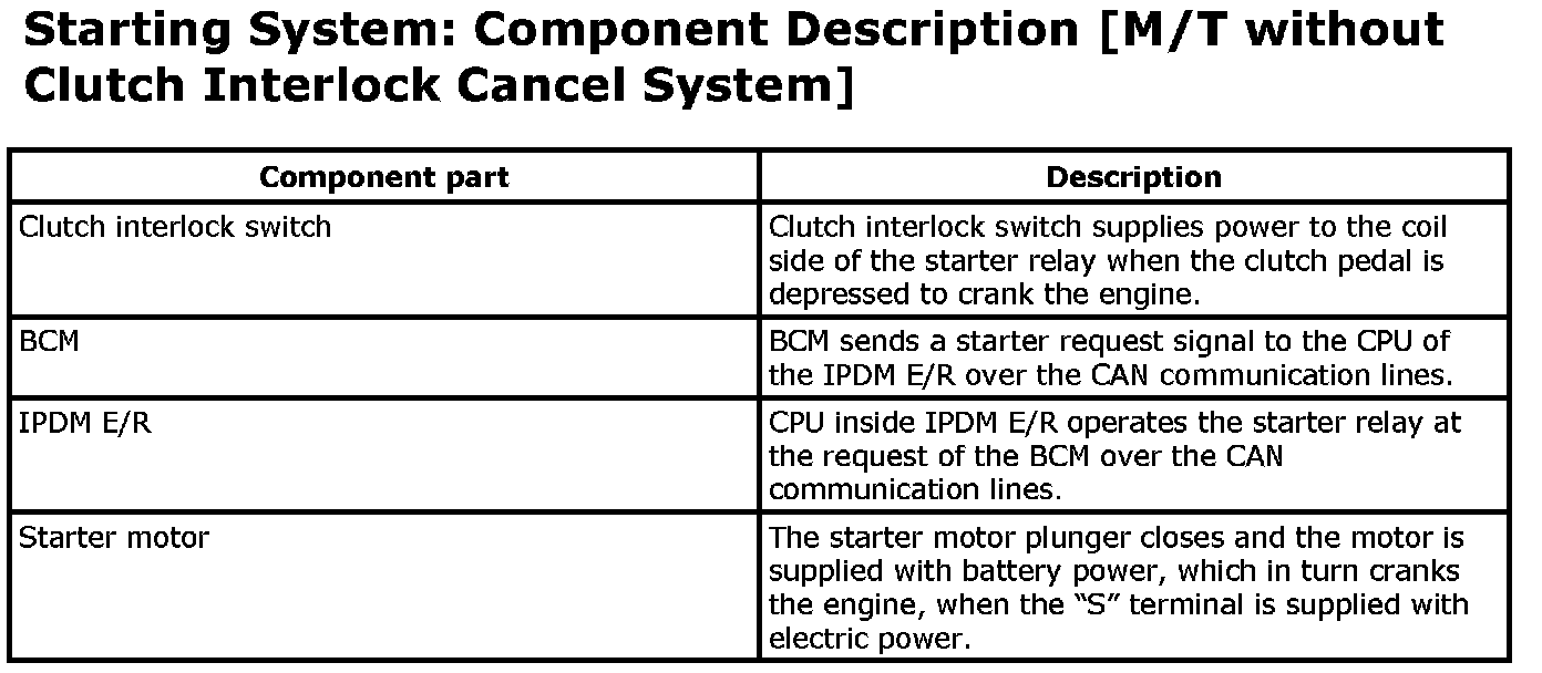 Starting System: Component Description [M/T Without Clutch Interlock Cancel System]