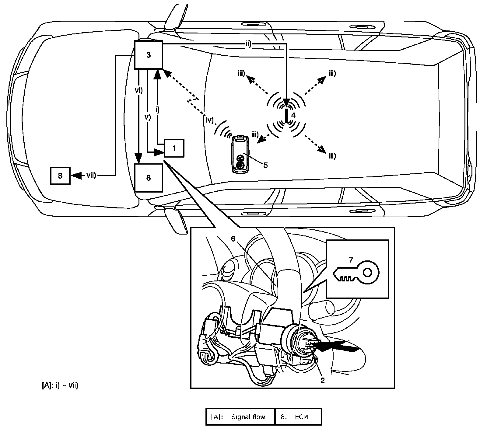 Description of Keyless Engine Start FunctionWhen the ignition knob switch (2) installed to the steering lock unit (1) is pushed, the keyless start control module (3) activates the center antenna (4) to send out the request signal in the vehicle compartment. When the remote controller (5) receives the request signal from the center antenna, it transmits the ID code to the keyless start control module. The keyless start control module compares the ID code sent by the remote controller with the ID code registered in the keyless start control module. When these ID codes match, the keyless start control module makes the key indicator light (7) in the combination meter (6) light in blue and unlocks the steering lock unit to enable the ignition knob switch to turn. When the ignition knob switch is turned to ON position in this state, ID codes of ECM and keyless start control module are compared through CAN communication (immobilizer function). When they match, turning the ignition knob switch to start position will start the engine.