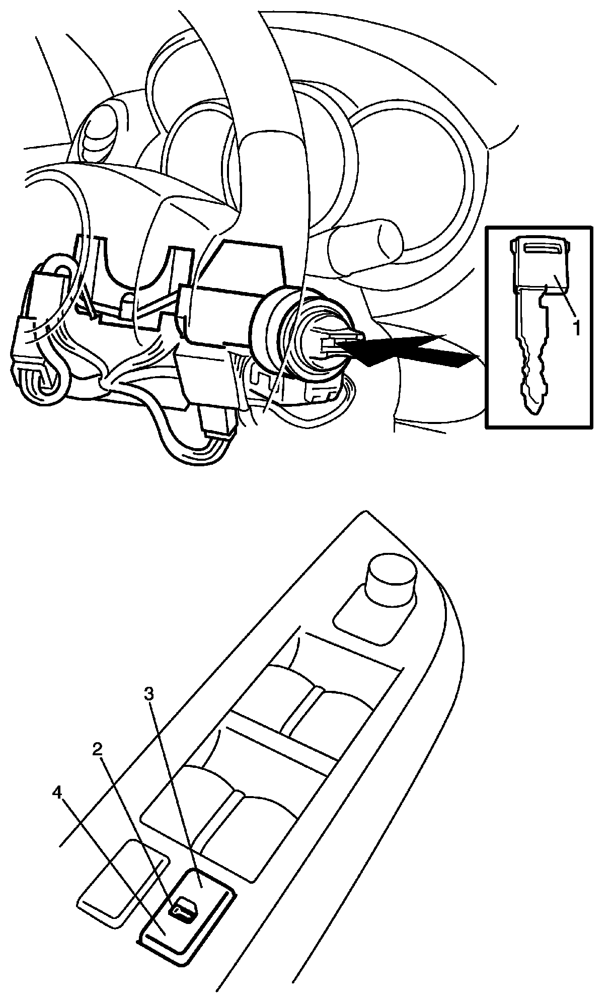 3. Insert ignition key (1) into ignition key cylinder.