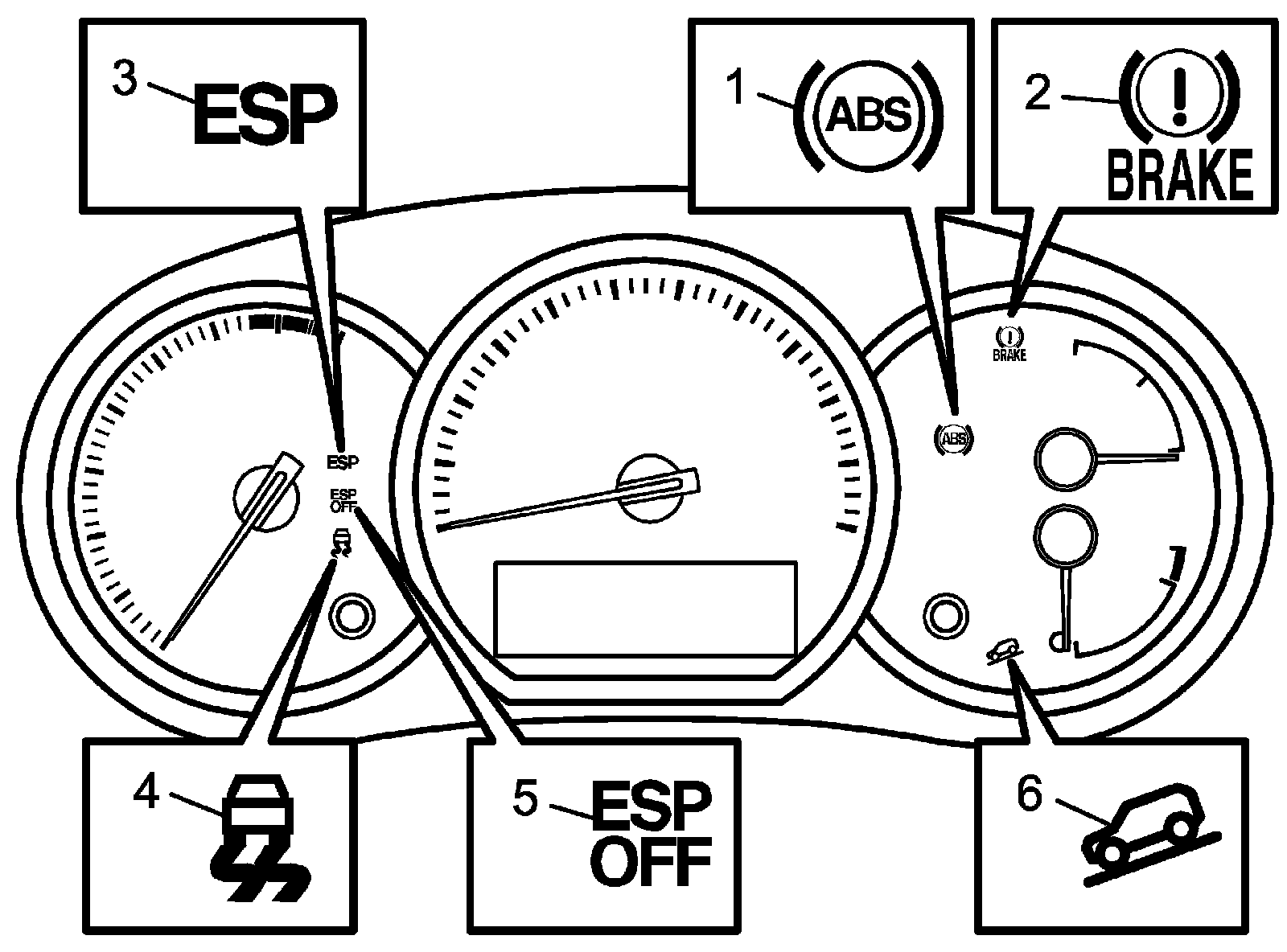 ESP(R) control module monitors each input and output signals. When ESP(R) control module detects any malfunction, some of ABS warning light (1), EBD warning light (brake warning light) (2), ESP(R) warning light (3), SLIP indicator light (4), ESP(R) OFF light (5), hill descent control indicator light (if equipped) (6) are turned ON and indicate the abnormality to driver.