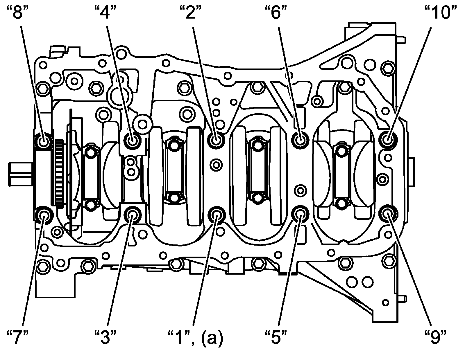 Apply engine oil to bolt threads and seats of crank case bolt No.1 and tighten bolt to 50 Nm (5.1 kgf-m, 37.0 lbf-ft) in numerical order ("1". "10") evenly and gradually.