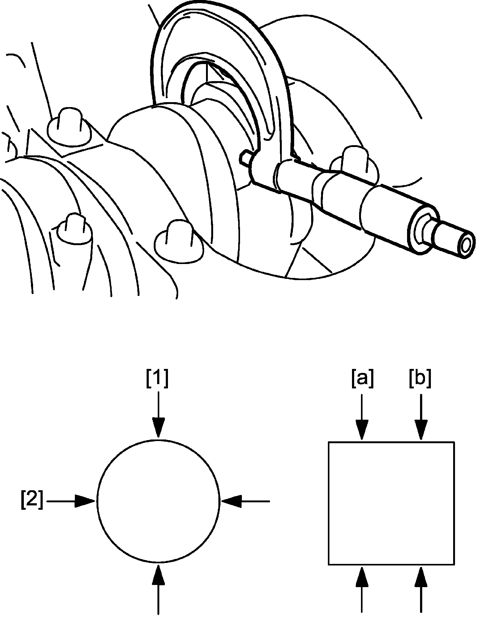 Crankshaft pin taper ([a] -[b]) and out-of-round ([1] -[2])