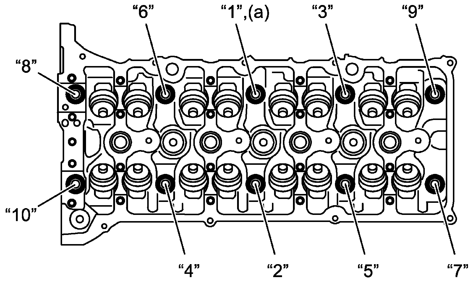 Tighten cylinder head bolts to 20 Nm (2.0 kgf-m, 15.0 lbf-ft) in numerical order ("1" - "10") evenly and gradually.