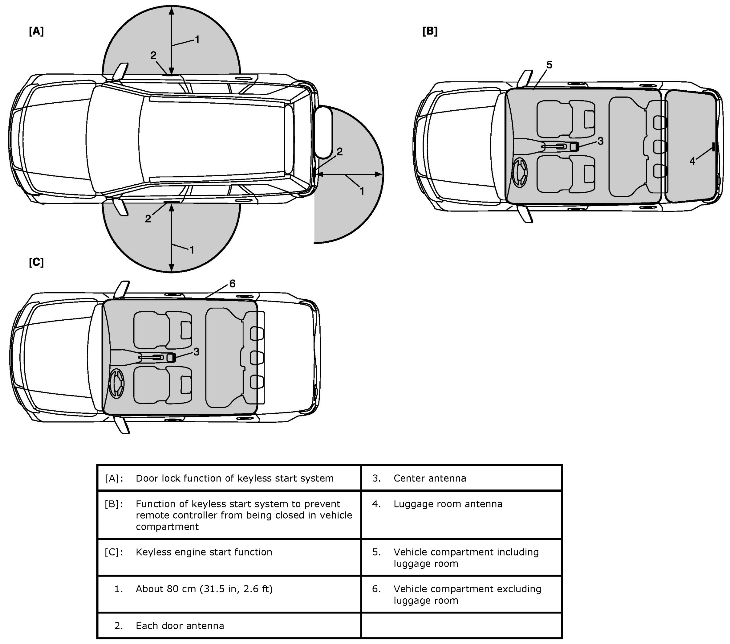 Description of Remote Controller Operation AreaShown below are the operation areas of the remote controller for the keyless engine start function and door lock function of the keyless start system.