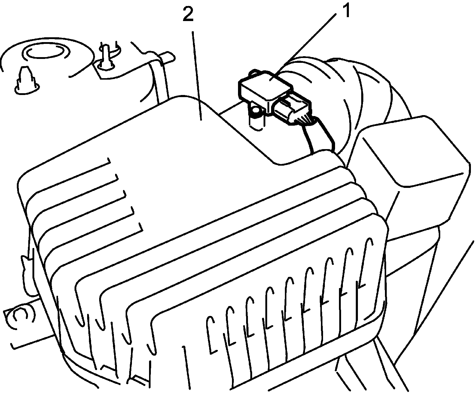 3. Remove MAF and IAT sensor (1) from air cleaner case (2).