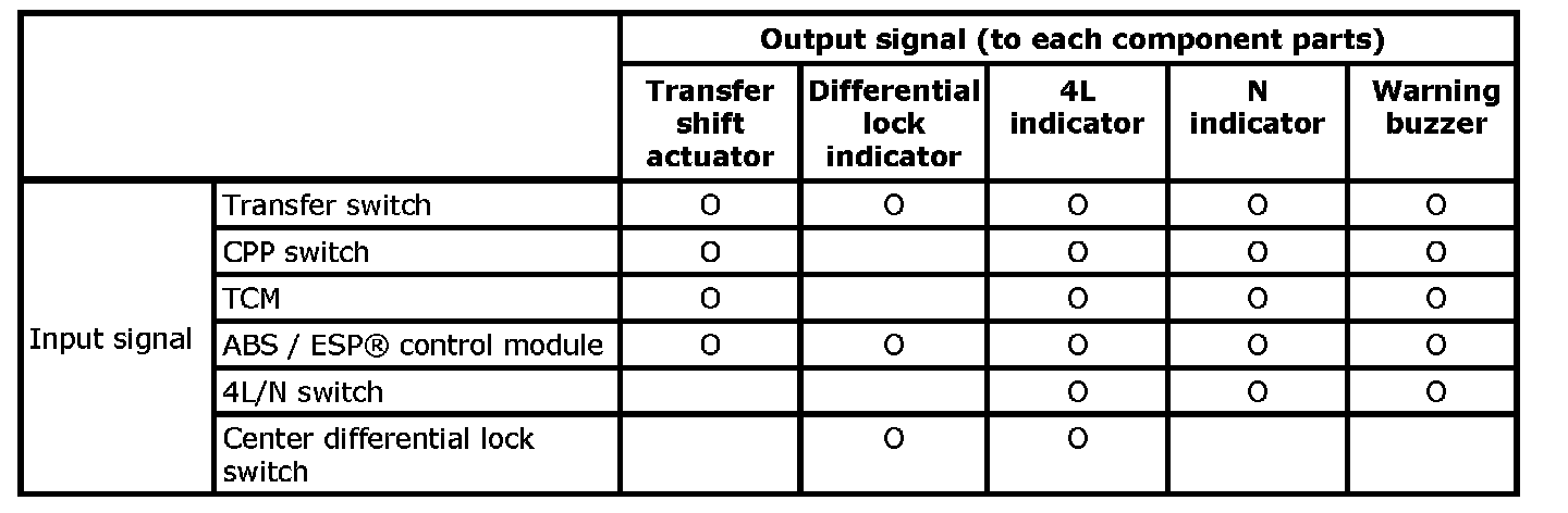 4WD control module outputs the following signals to actuators, indicators, warning buzzer, according to the transfer switch operation.