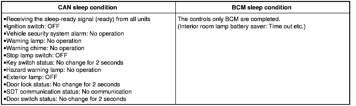 - BCM is in the low power consumption mode and perform the low power consumption control when all of the BCM sleep conditions are fulfilled with CAN sleep condition.