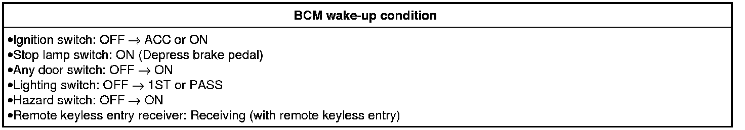 - BCM transmits sleep wake up signal (wake up) to each unit when any condition listed below is established, and then goes into normal mode from low power consumption mode.