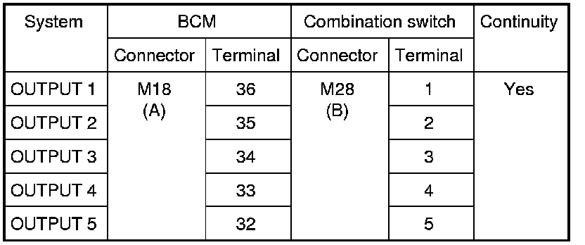 3 Check continuity between BCM harness connector and combination switch harness connector.