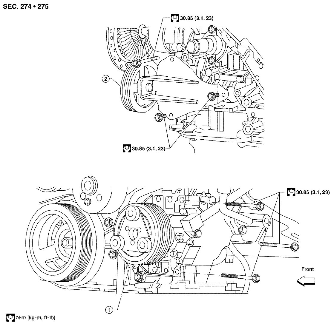 7) Remove the drive belt. Refer to [Drive Belts: Removal and Installation] Removal and Installation (QR25DE), [Drive Belts: Removal and Installation] Removal and Installation (VQ40DE).