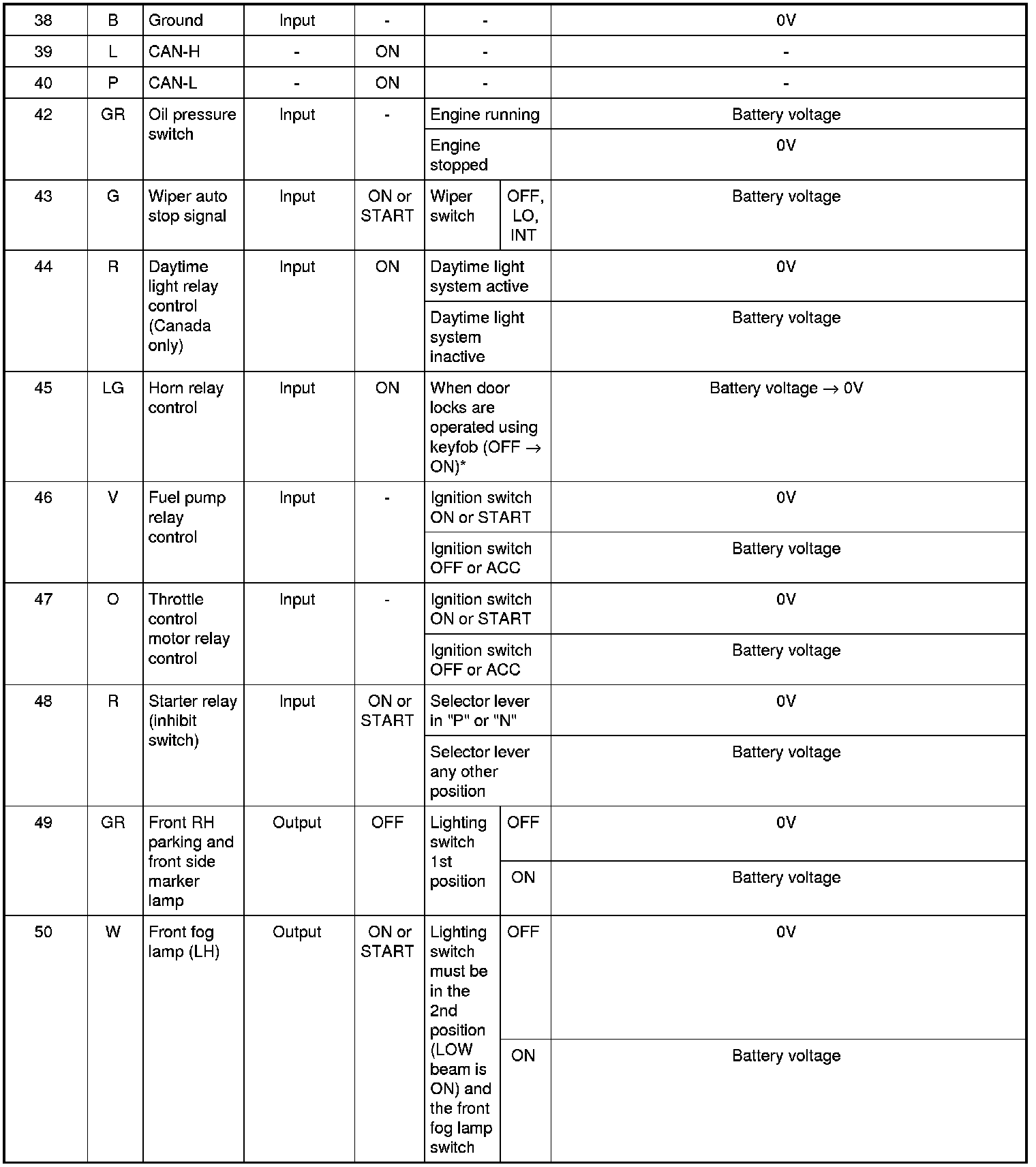 Pinout Values and Diagnostic Parameters