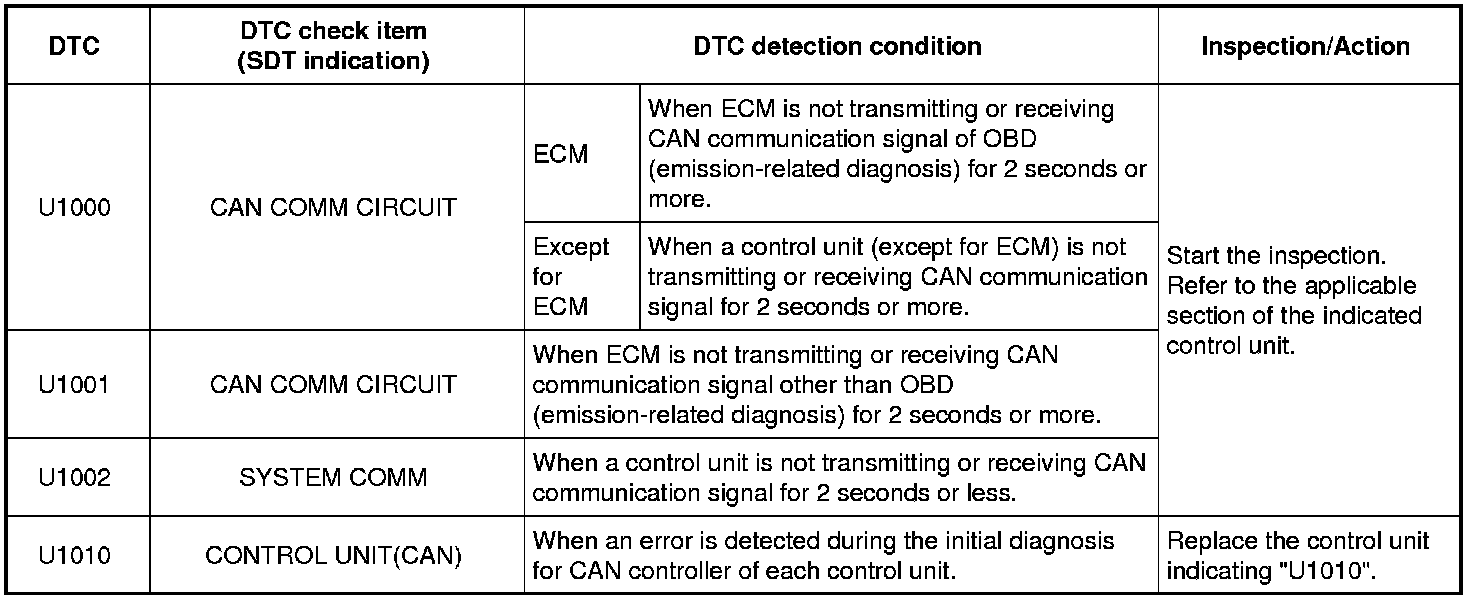 If communication signals cannot be transmitted or received among units communicating via CAN communication line, CAN communication-related DTC is displayed on the SDT "DTC check" screen.