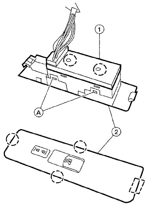 4) Release the four tabs (A), two on each side, then separate the front power window/door lock switch (1) - RH from the front power window/door lock switch finisher (2) - RH.