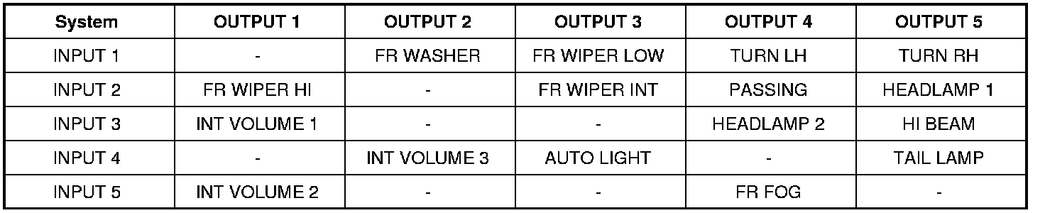 - The circuits between INPUT 1 and OUTPUT 5 and between INPUT 1 and OUTPUT 3 are formed when the TURN RH switch and FR WIPER LOW switch are turned ON.